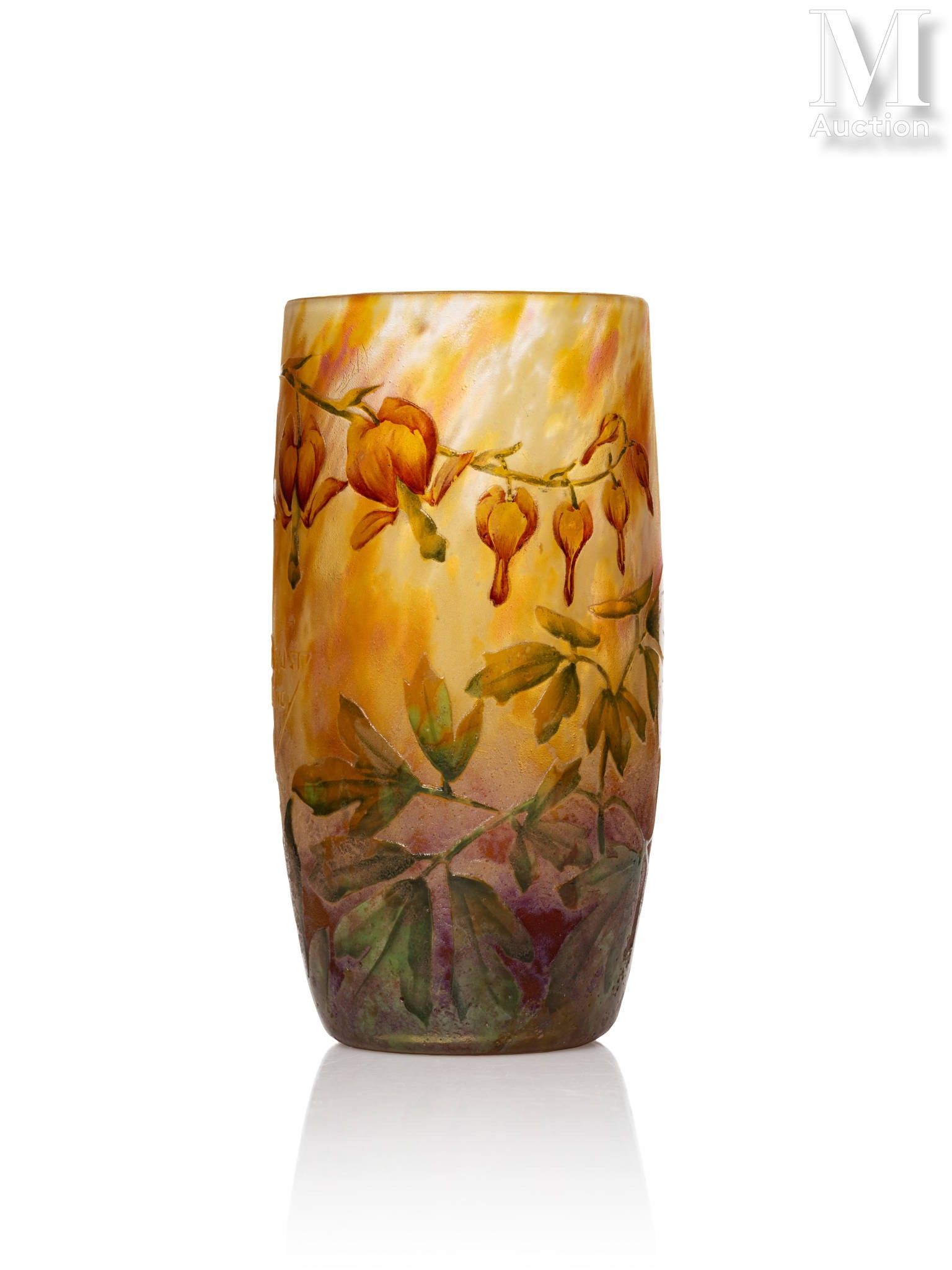 A "Lyre flowers" multilayer glass vase by Daum - Nancy with a finely etched and green and red enamelled decor of flowers on a yellow orange background. Signed "Daum # Nancy".