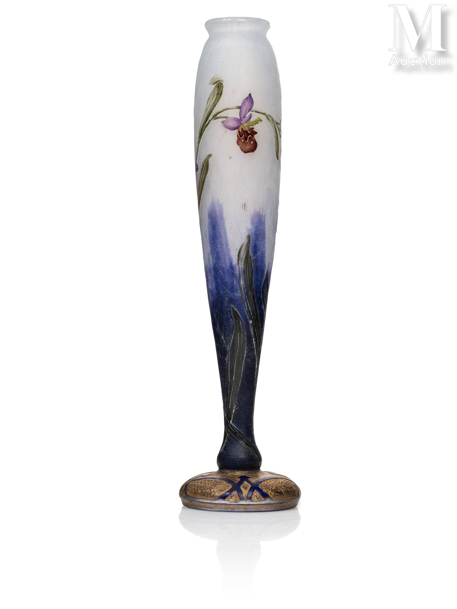 An "Orchis and spiderwebs" double glass vase by Daum - Nancy with a finely etched ad enamelled decor of orchids and spiders' webs on an acid frosted background with purple and milky white powders. Signed "Daum # Nancy" in the decor.