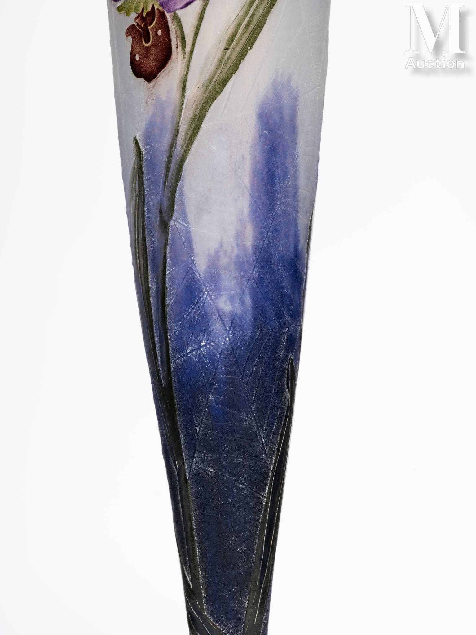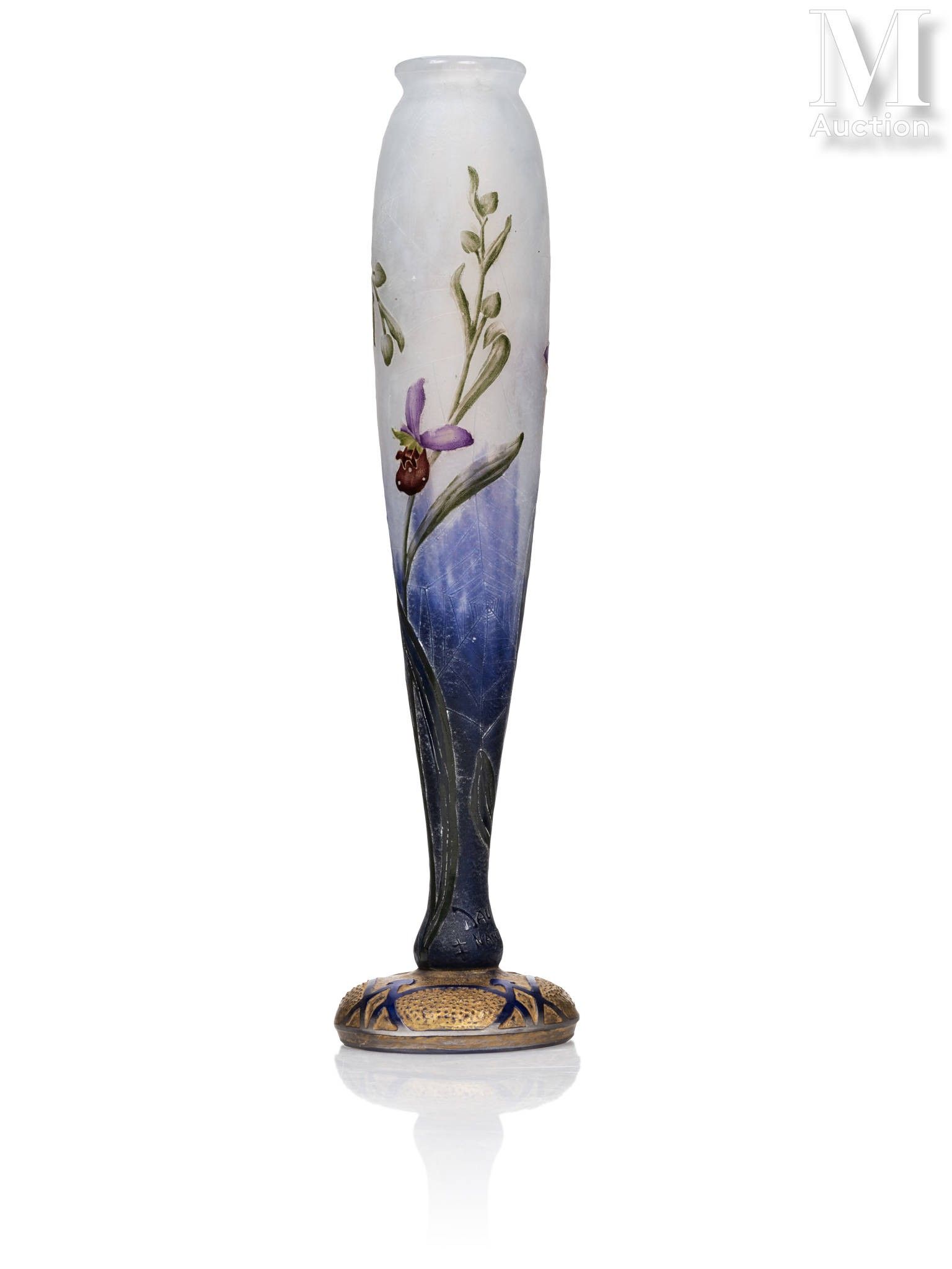 A double glass vase of conical form with an overhanging circular base, with enamelled and finely engraved decoration in reserve of ophris orchids and spider webs on an acid frosted ground speckled with purple and milky white intercalary powders.