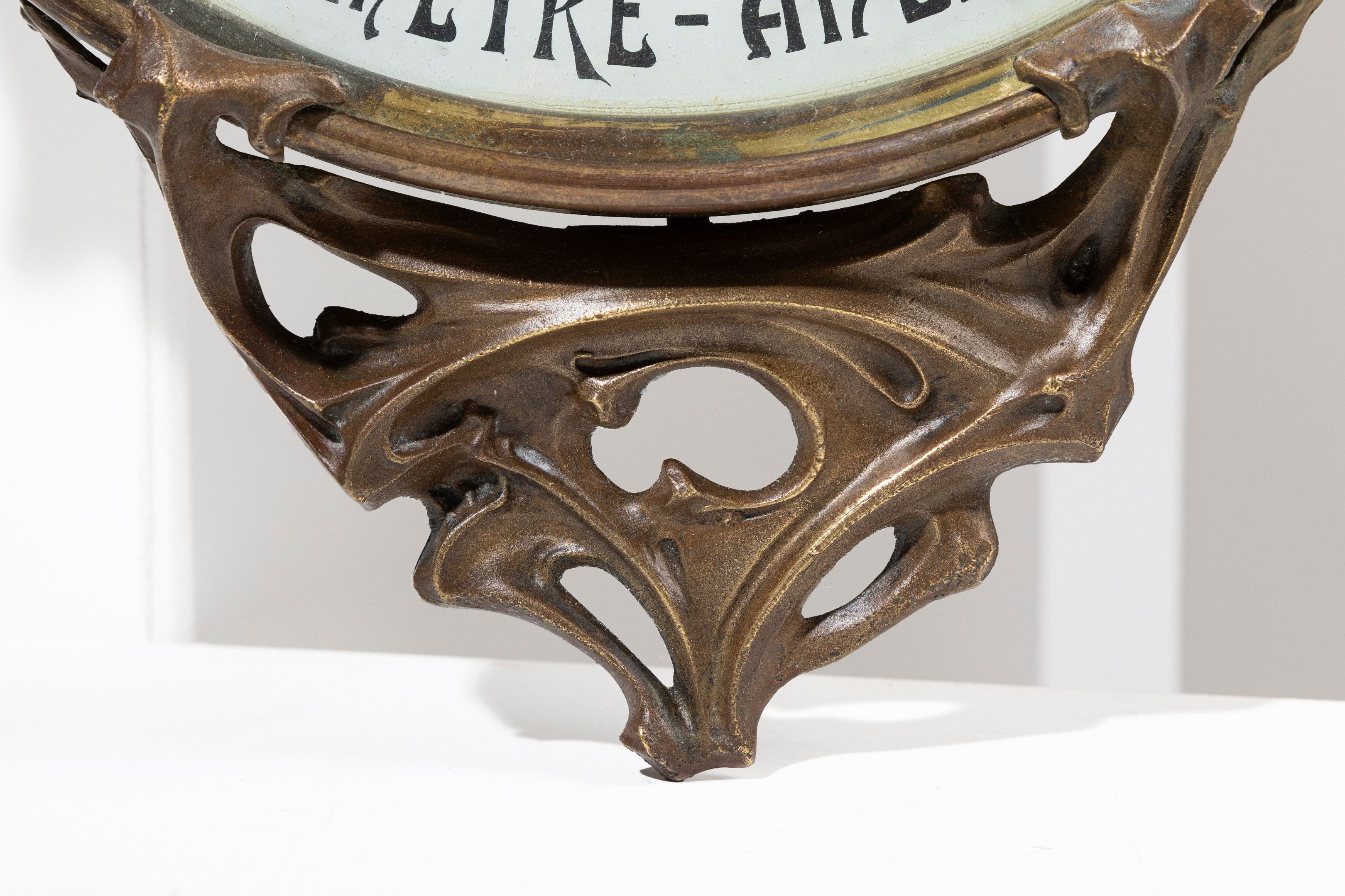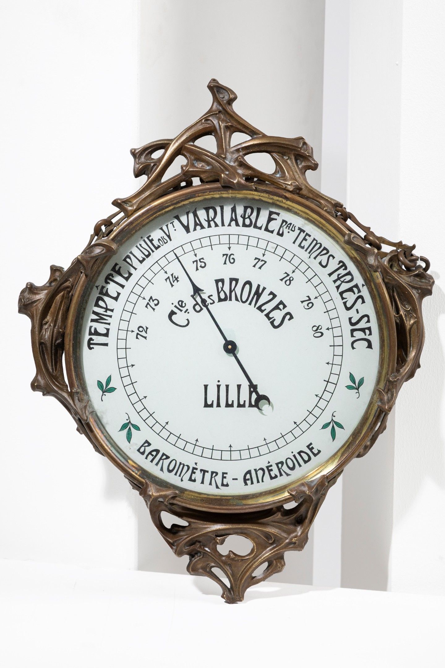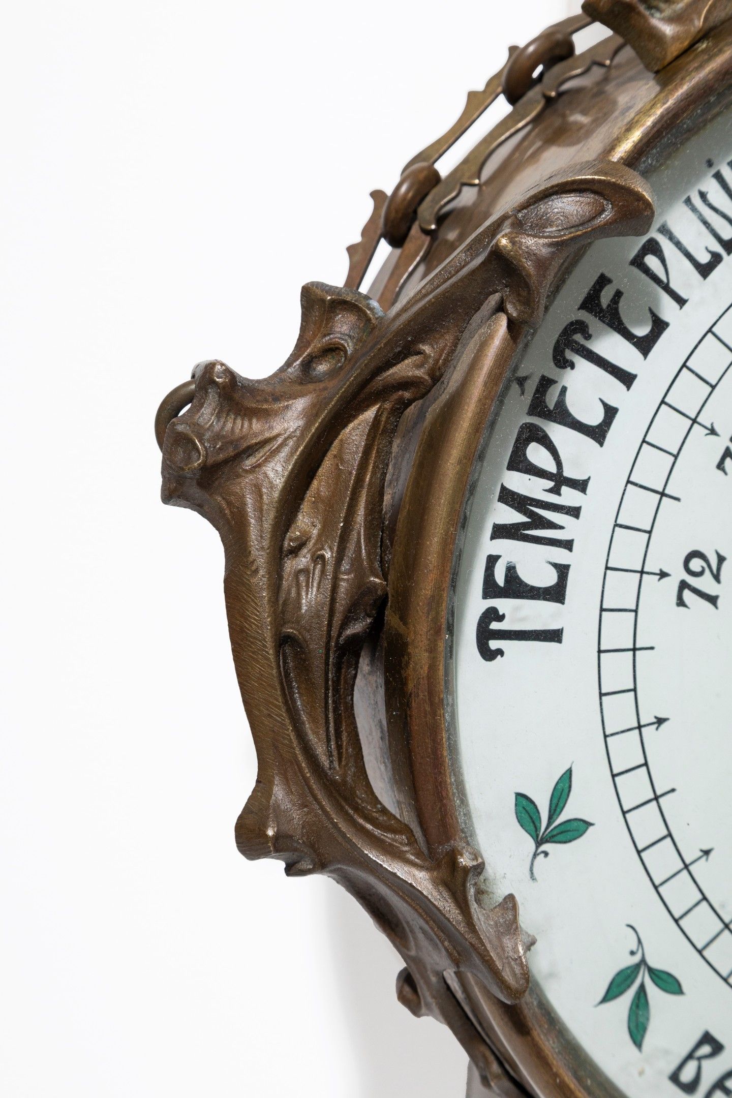 Wall barometer with circular copper case decorated with plant motifs in patinated bronze