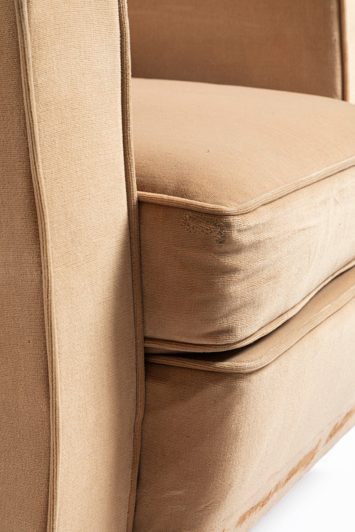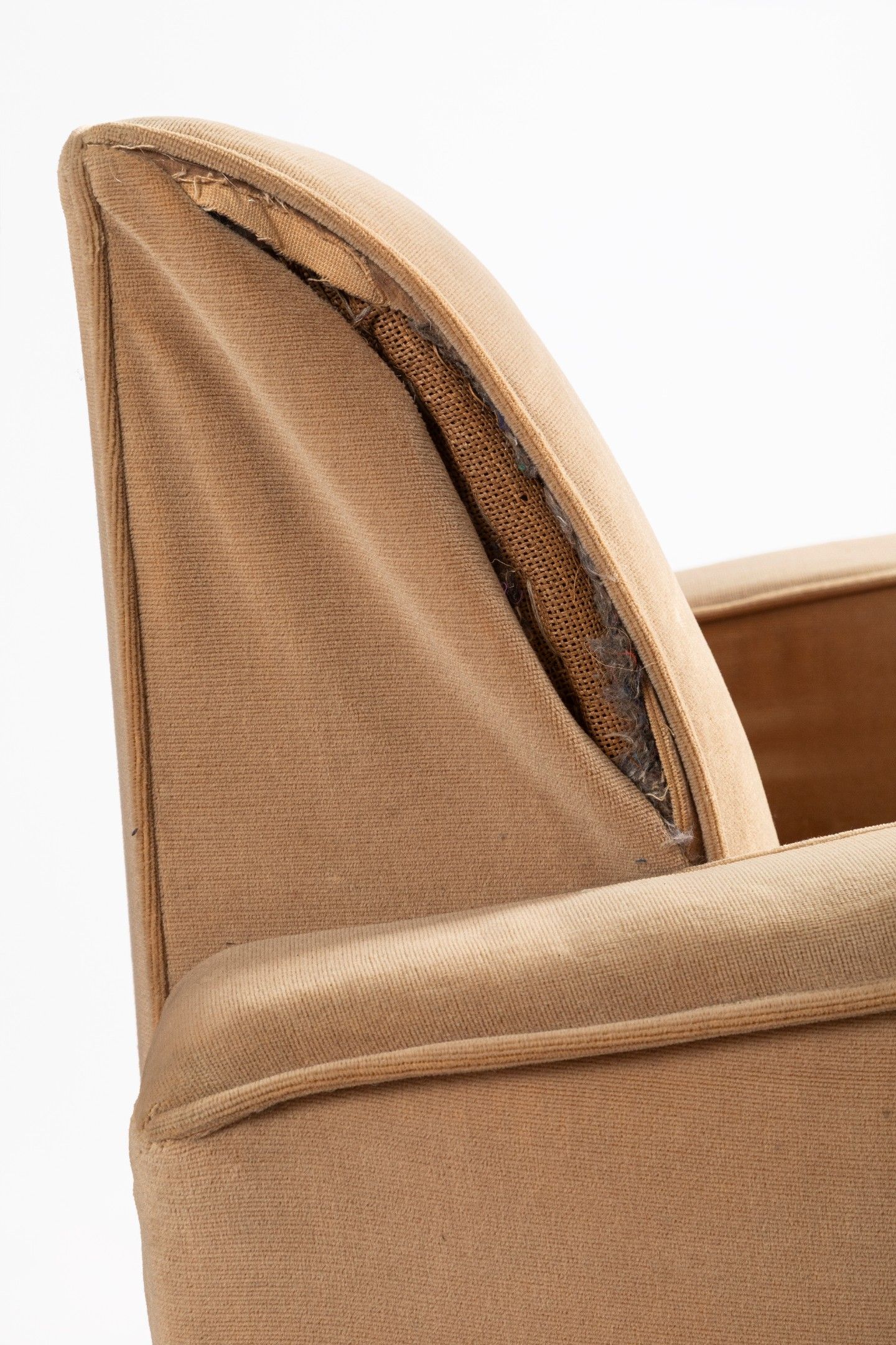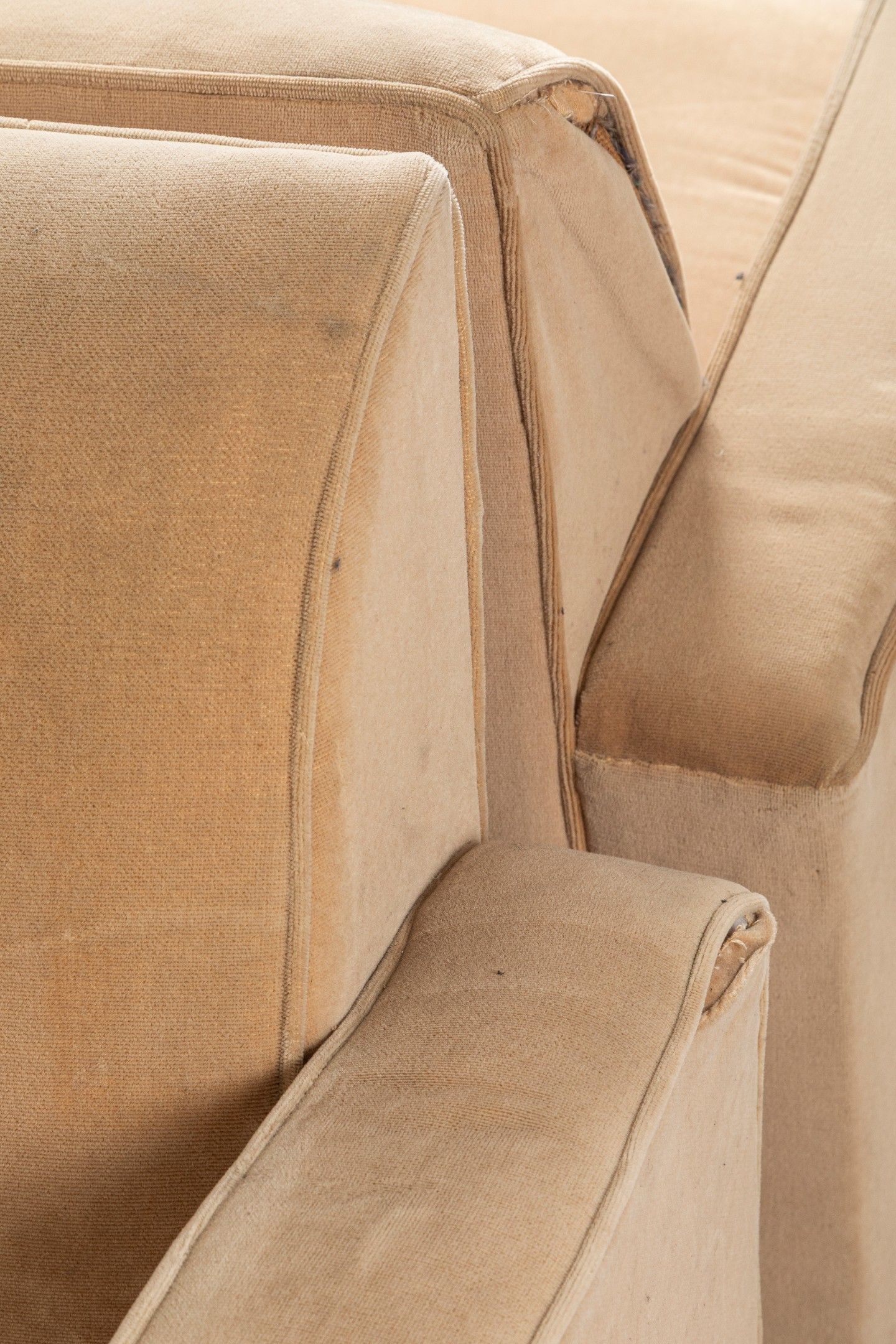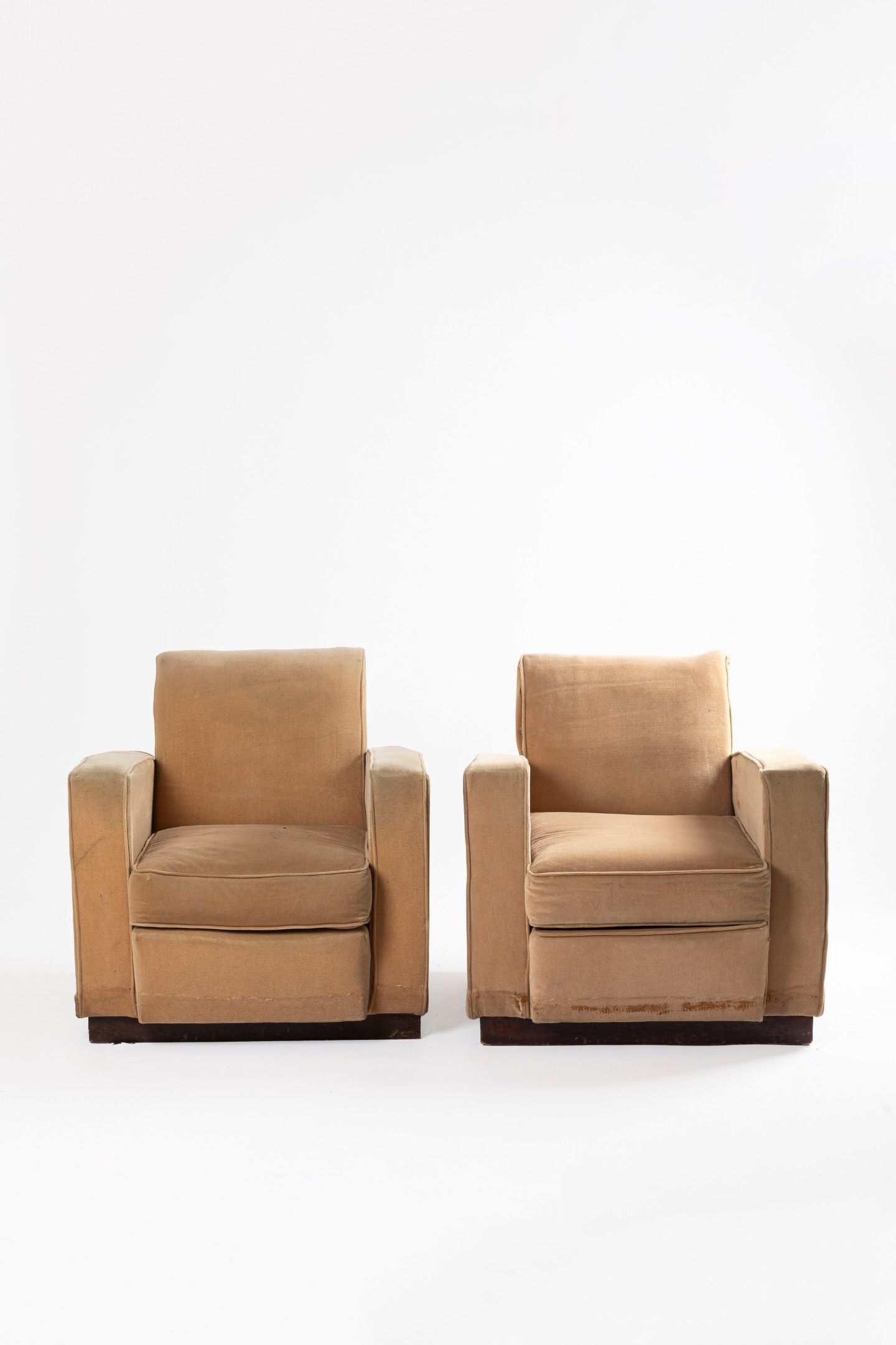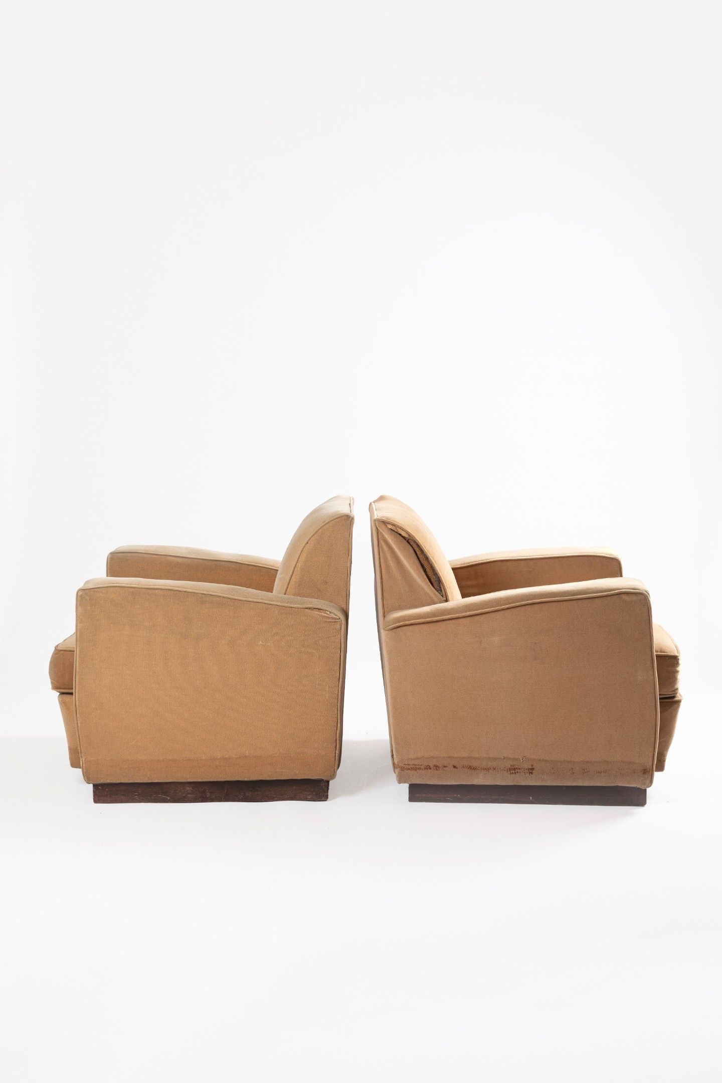 Pair of comfortable armchairs, wooden frame, beige fabric upholstery, all resting on a walnut veneered plinth
