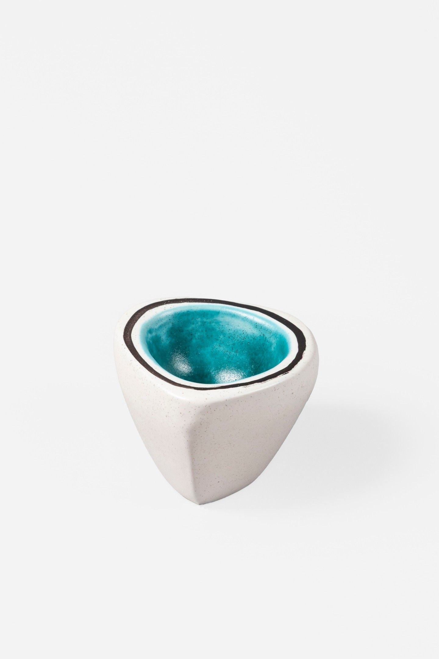 Free-form white and black glazed ceramic bowl with turquoise blue interior