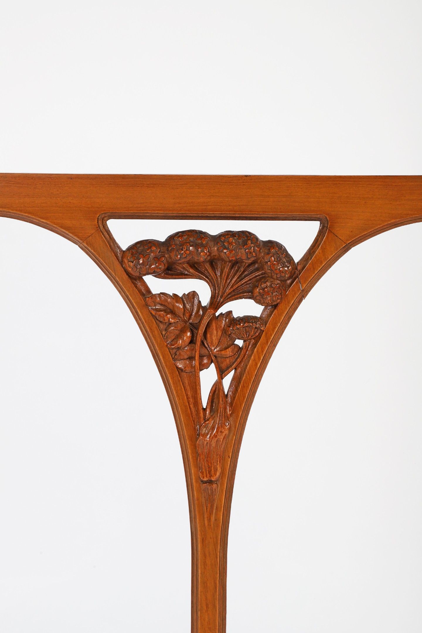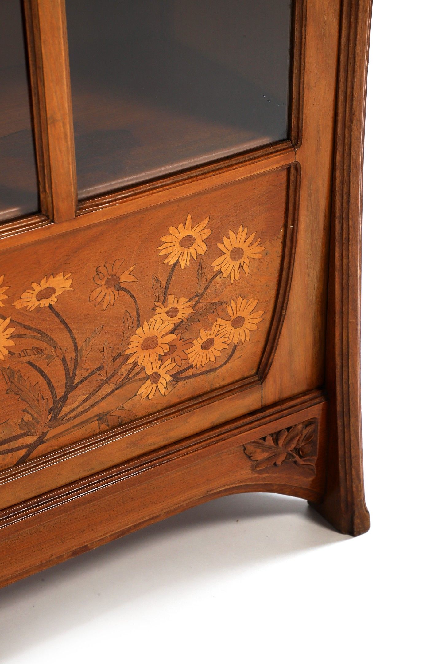 In moulded and carved walnut and walnut veneer, opening with a glazed door, the upper part carved in high relief with an umbel, the lower panel inlaid with aster flowers, surmounted by an upper niche.