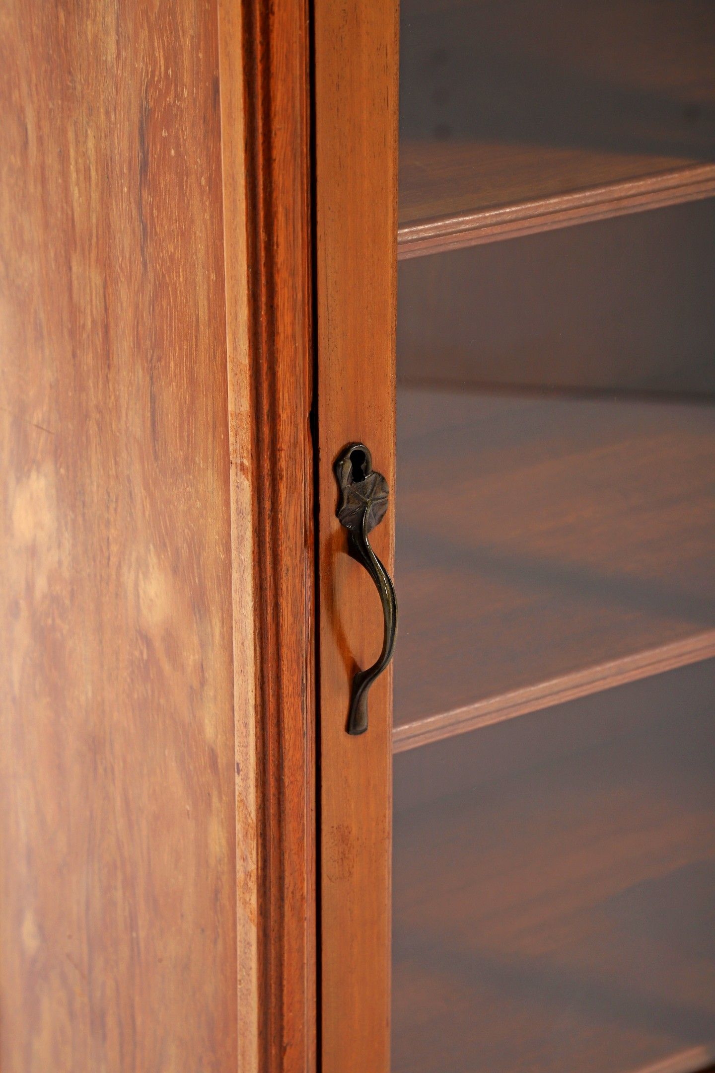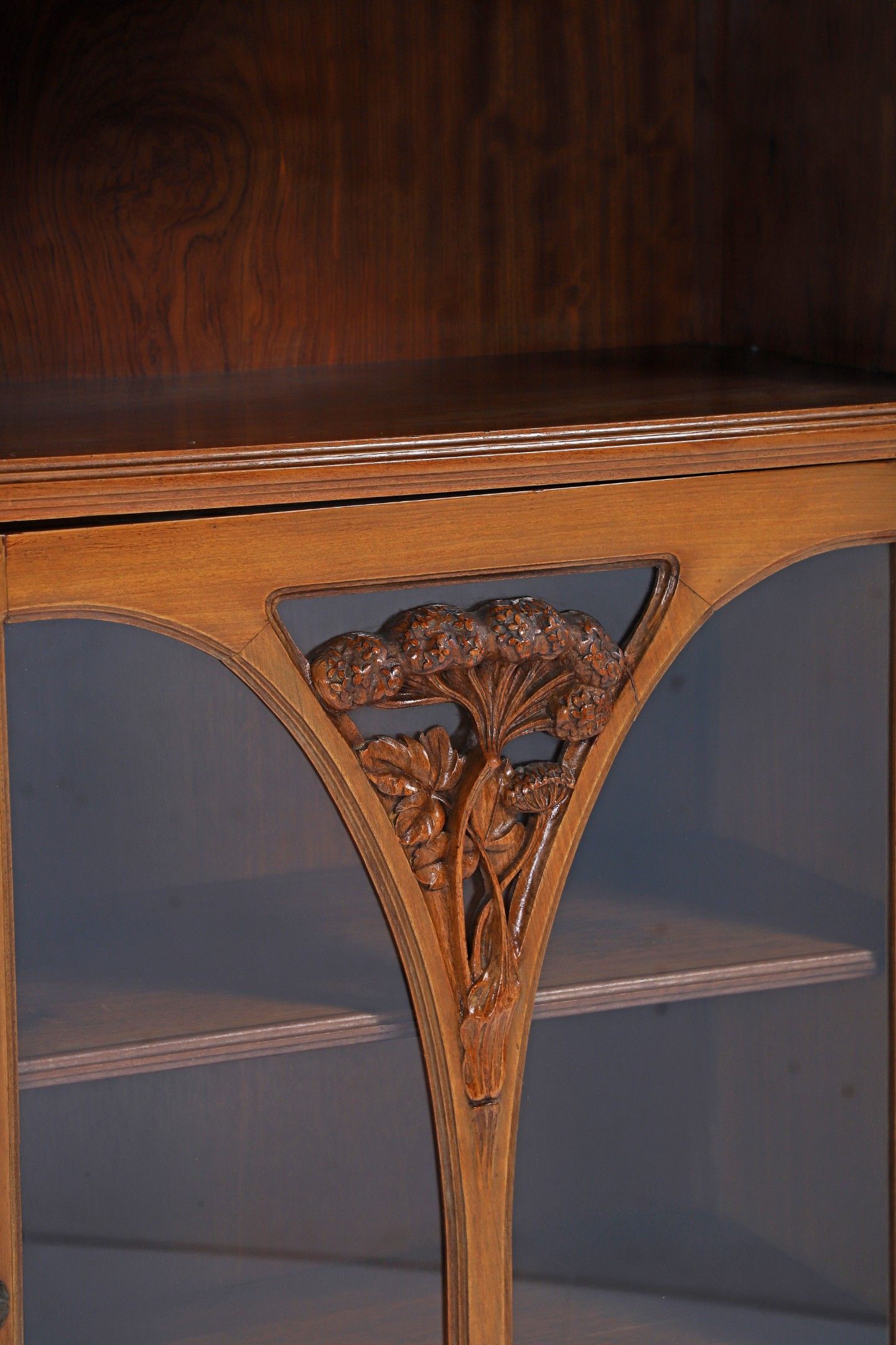 A carved walnut and walnut veneer showcase, glass door, inlaid decoration.