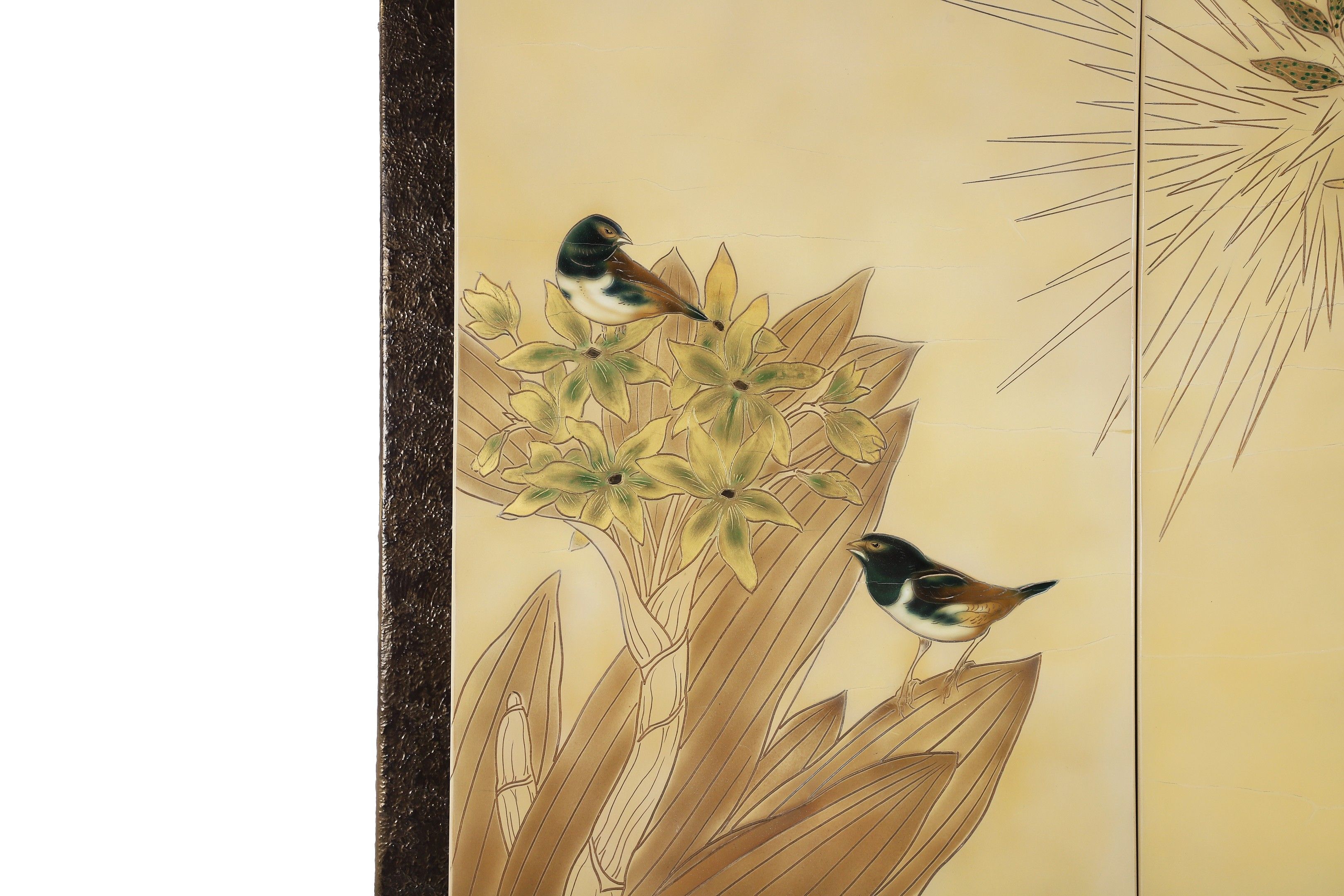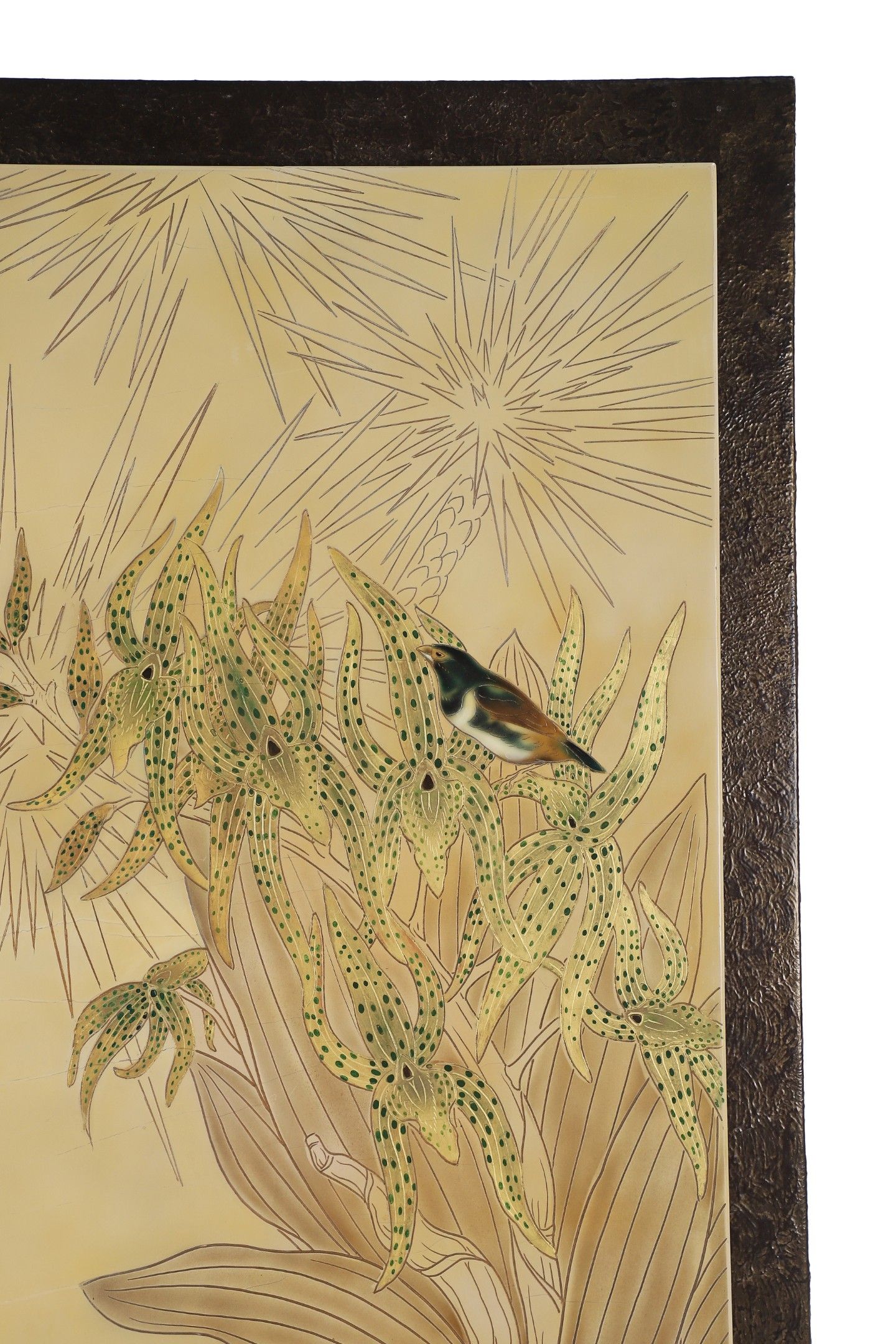 Set of two panels forming a diptych, in polychrome lacquer, with incised decoration of Chinese swallows and California bobwhites among ophrys enhanced with gold leaf on an ivory lacquer background, original frame in torn brown patina lacquer.