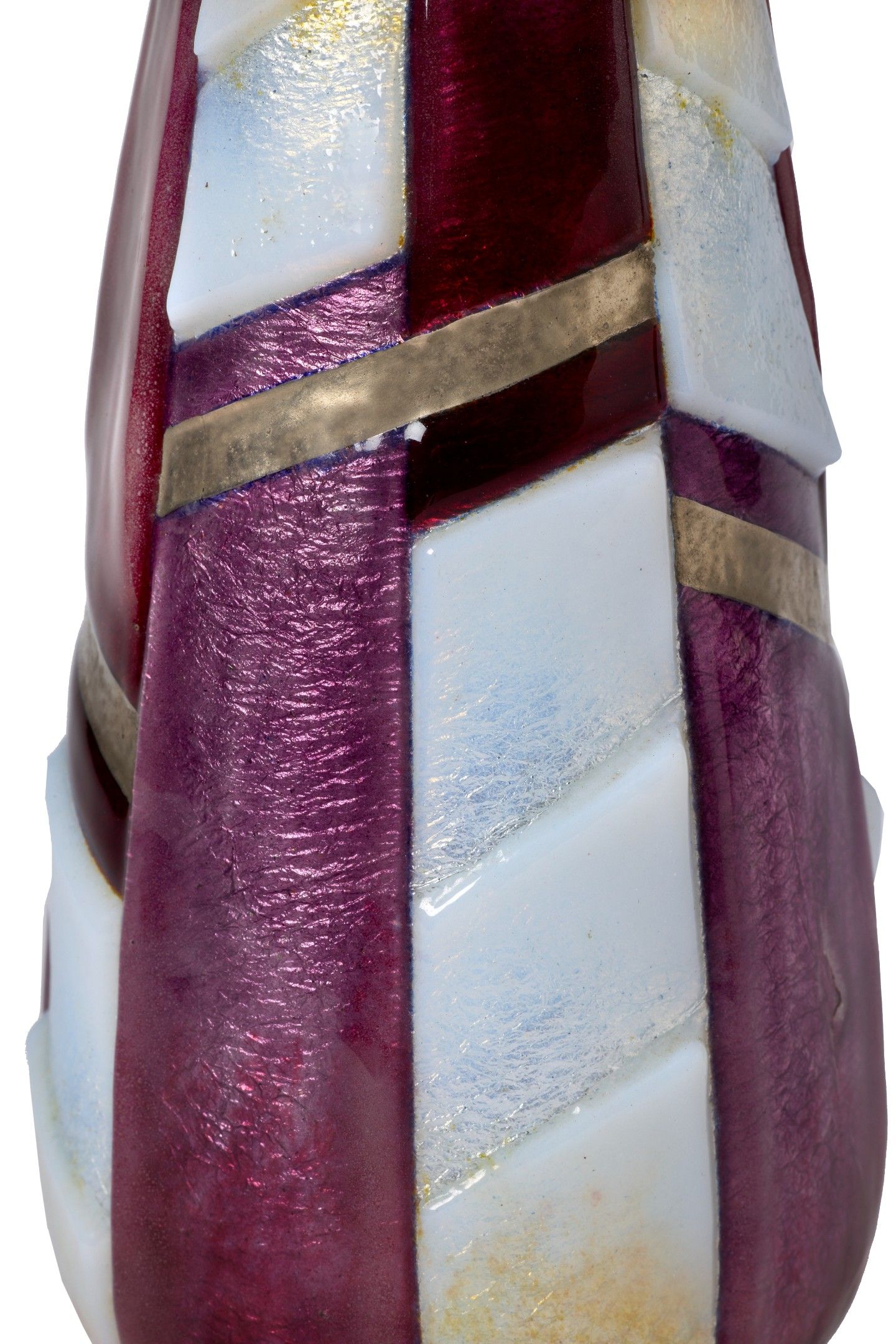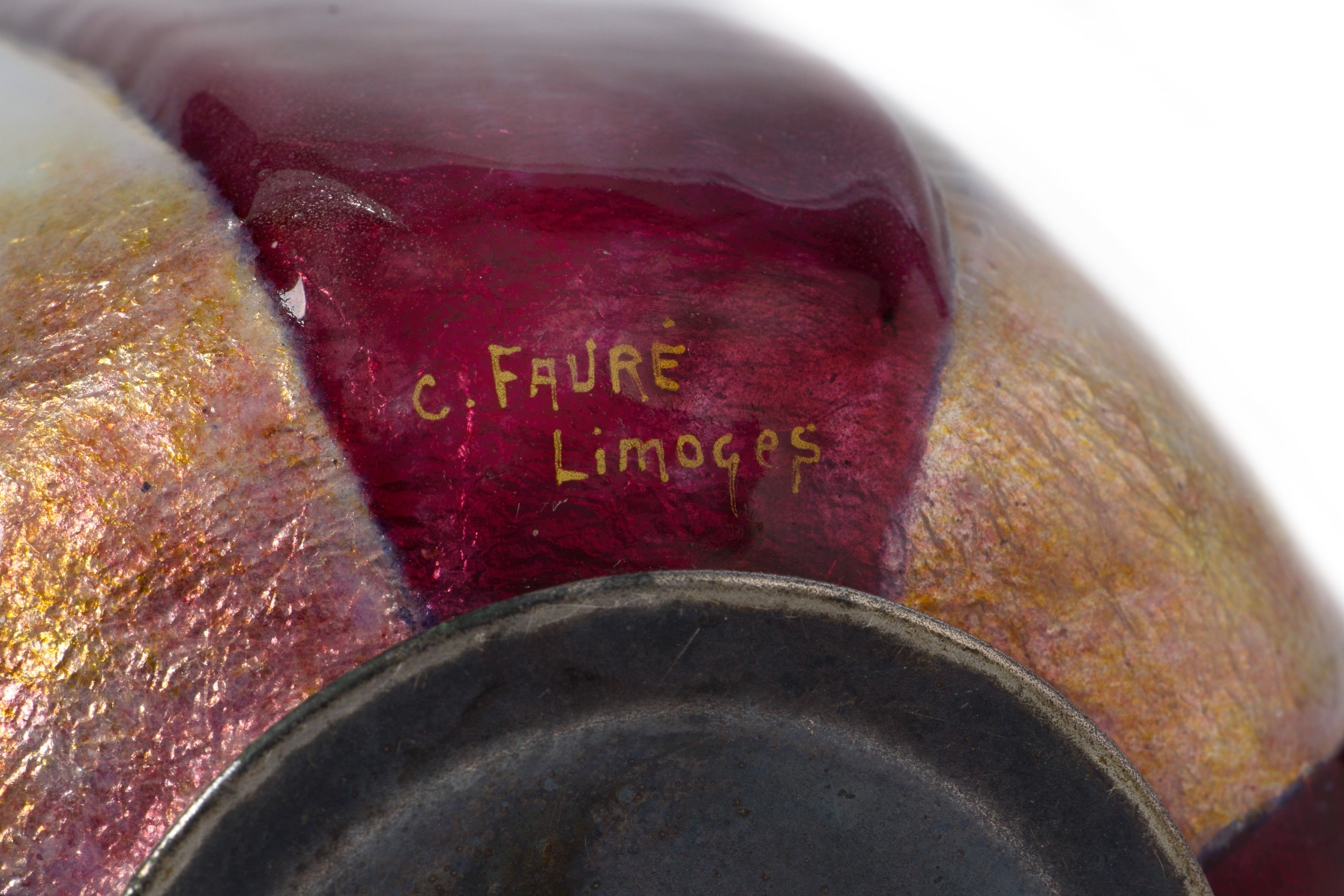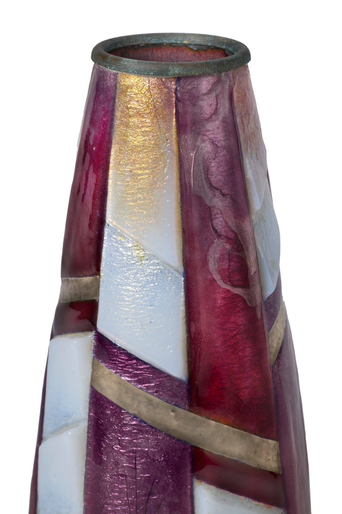 CAMILLE FAURÉ (1874-1956) Baluster vase. In polychrome enamelled copper and silver leaf, with geometric decoration in bas-relief, in pearlescent shades of white, mauve and purple, metal base and top ring. Enamelled signature 'C. Fauré. Limoges'. H. 18.8 cm - H. 7 3/8 in. A vase, polychrome enamelled copper and silver leaf, with geometric decoration. Signed.