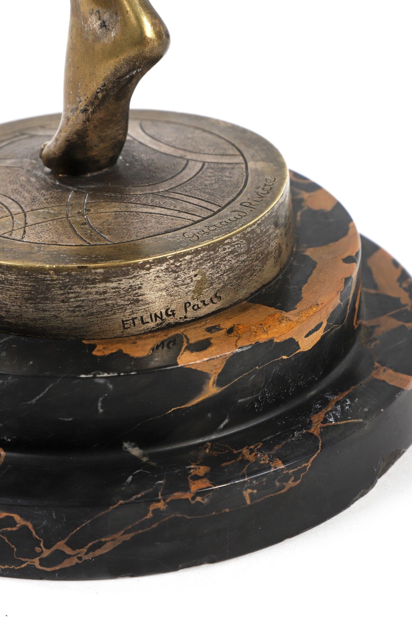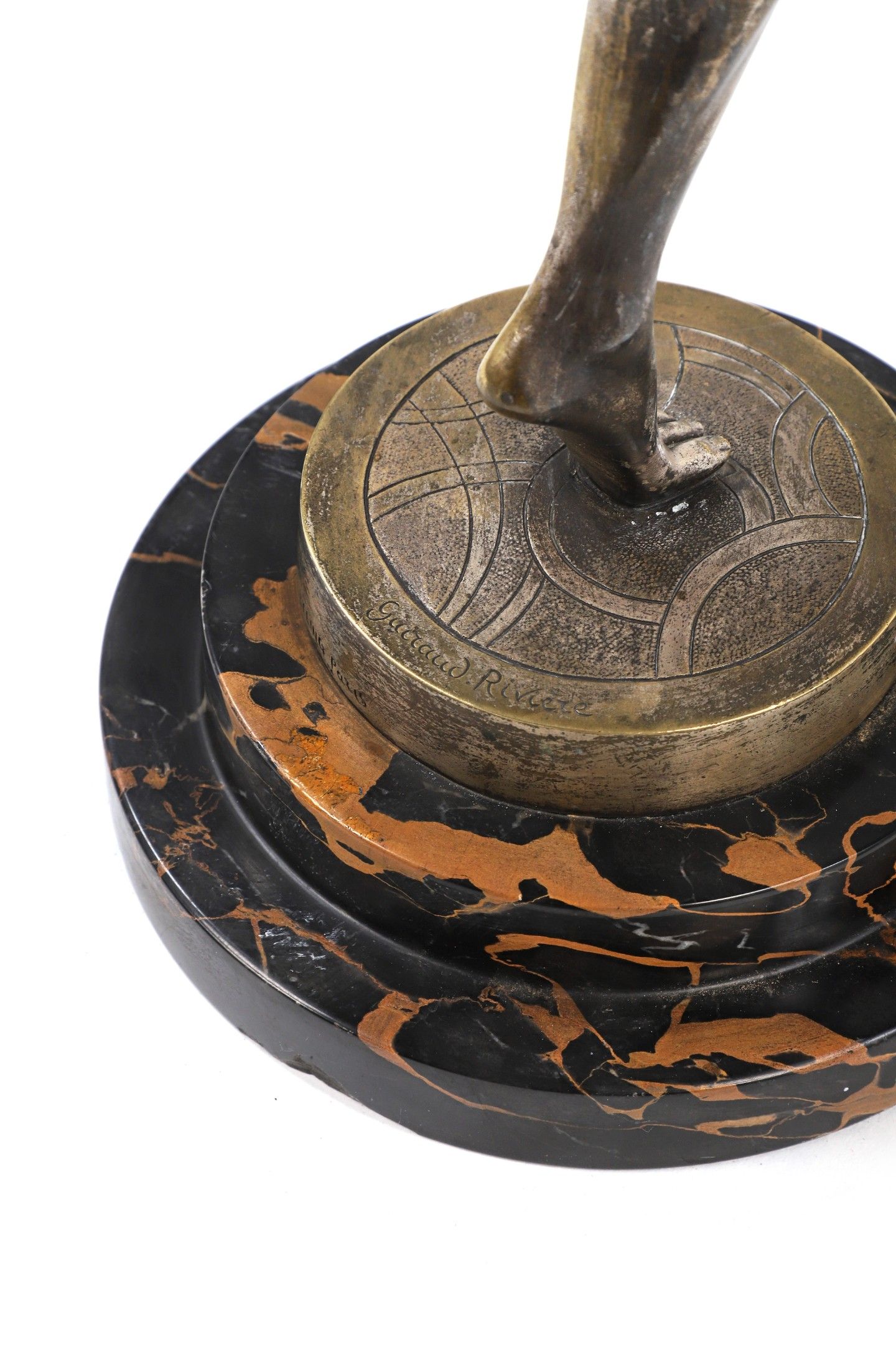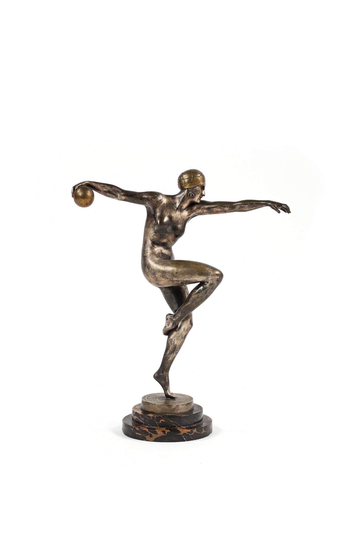IMPORTANT print in bronze with a silver and gilded patina depicting a dancer holding a ball in her hand, resting on a circular base decorated with arcs of circles, with a stepped base in Portor marble.