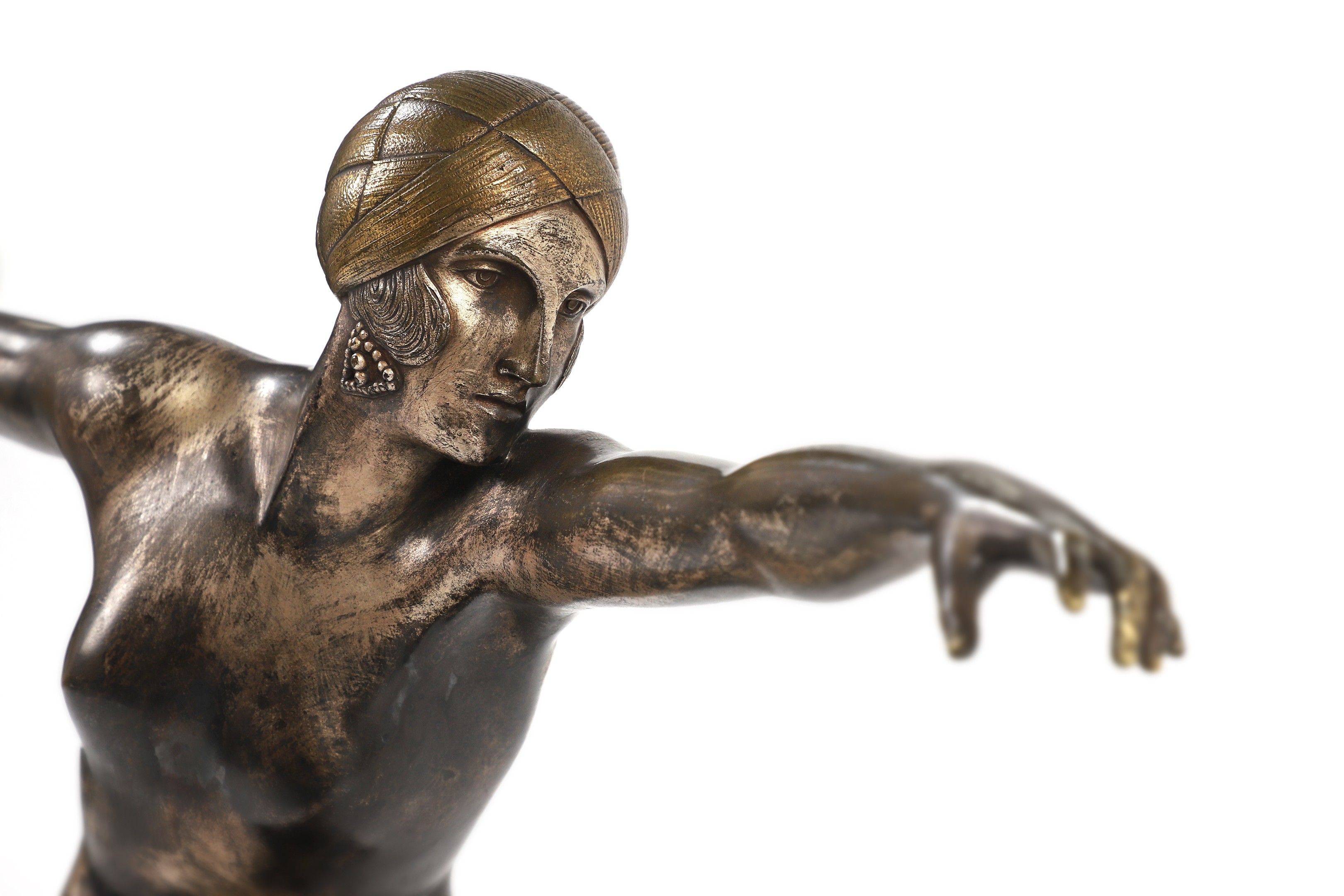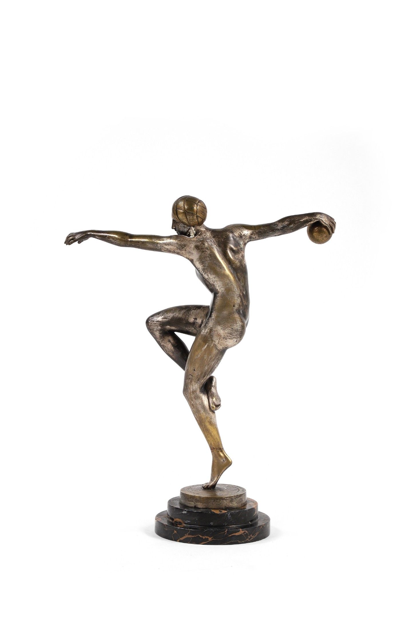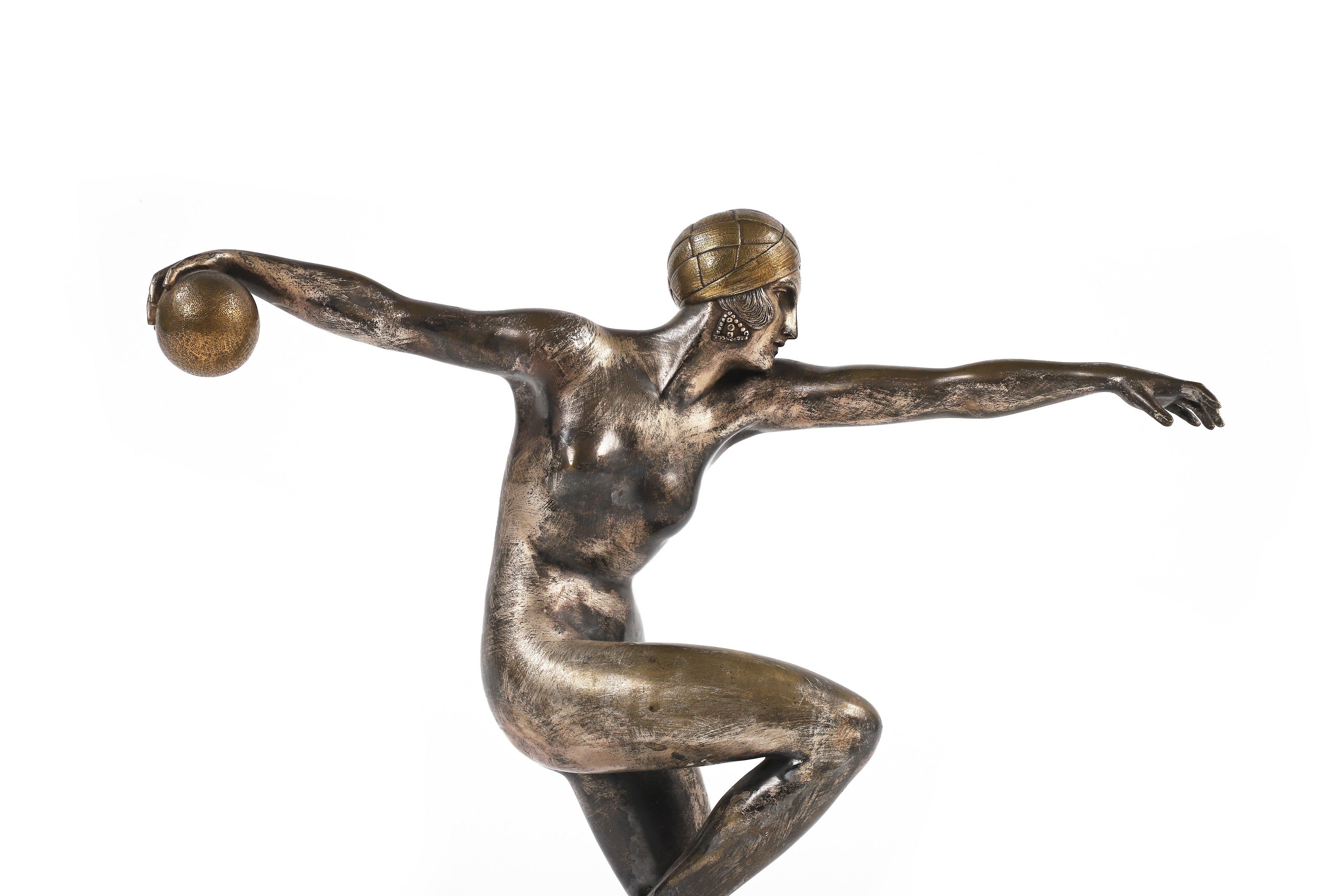 IMPORTANT print in bronze with a silver and gilded patina depicting a dancer holding a ball in her hand, resting on a circular base decorated with arcs of circles, with a stepped base in Portor marble.