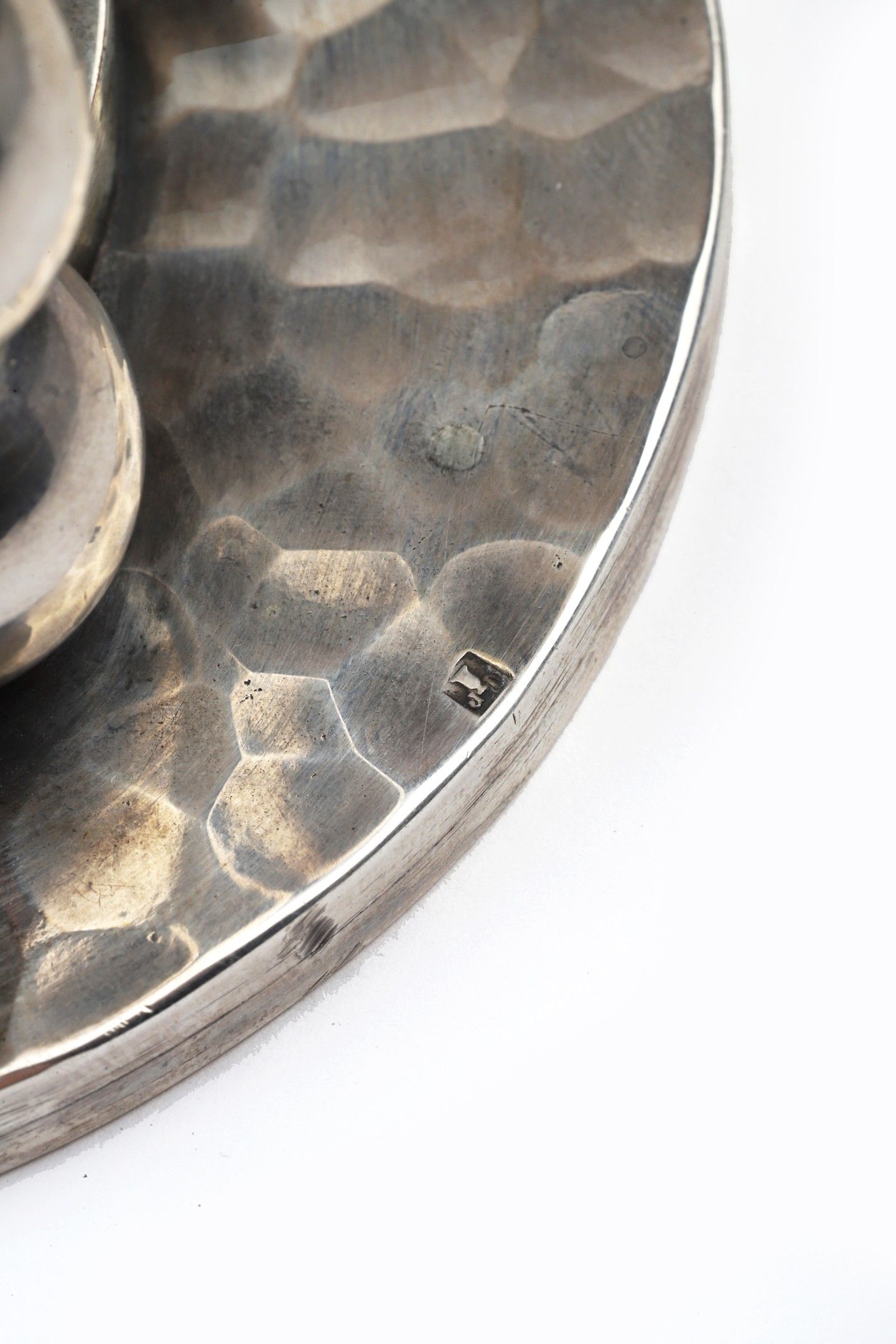 In silver-plated metal, cylindrical shaft decorated with two rows of two spheres, resting on a circular base with hammered surface.