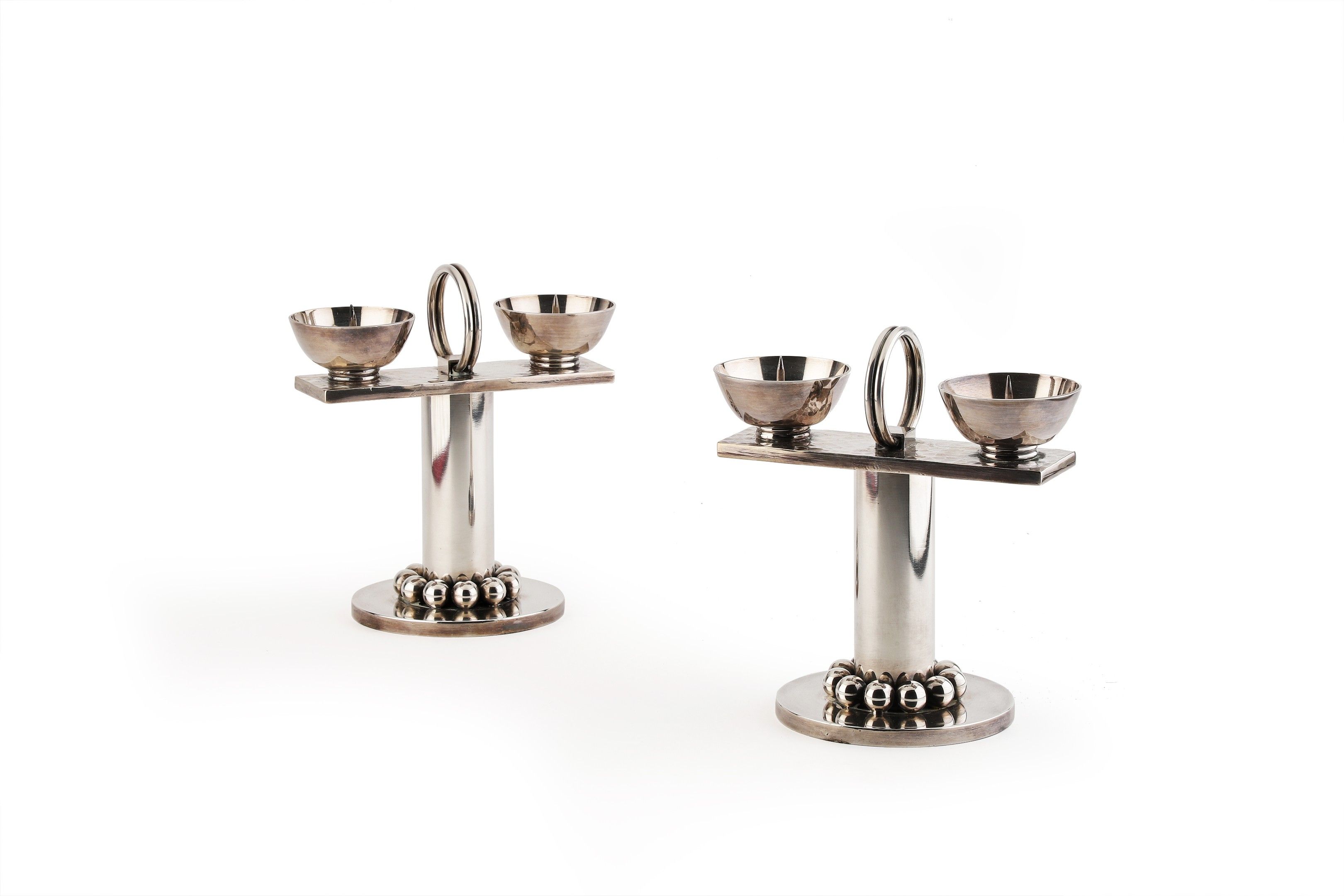 In silver-plated metal, each with two lights, rectangular plate with hammered surface housing two bobèches framing a double grip ring, wide cylindrical shaft decorated at the base with a frieze of spheres, resting on a smooth circular base.