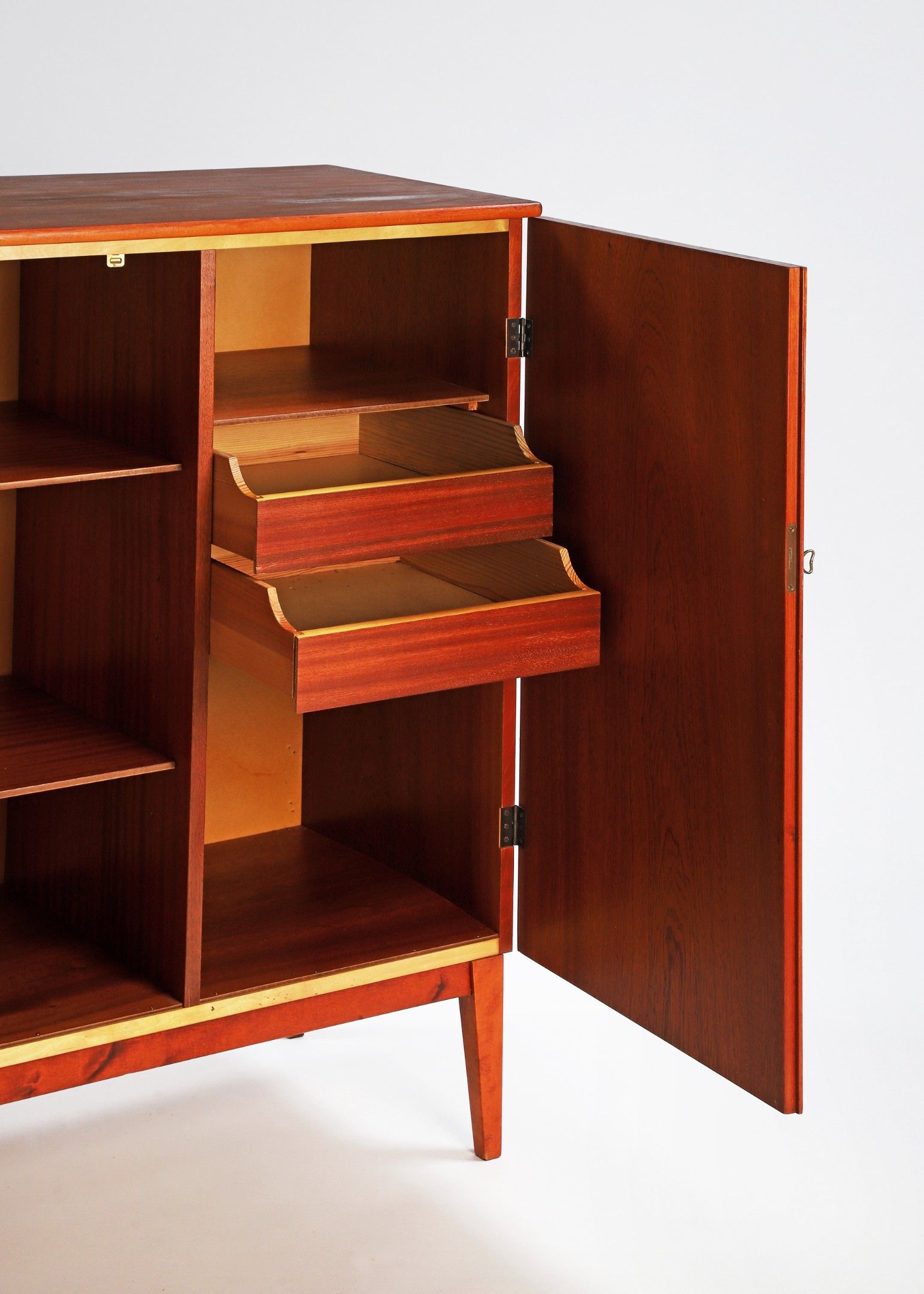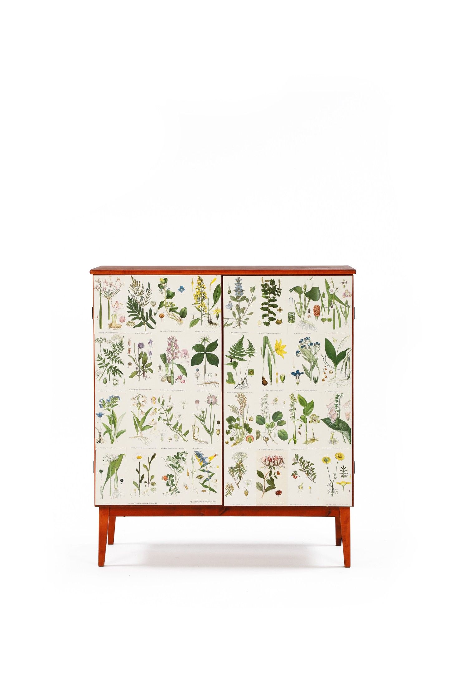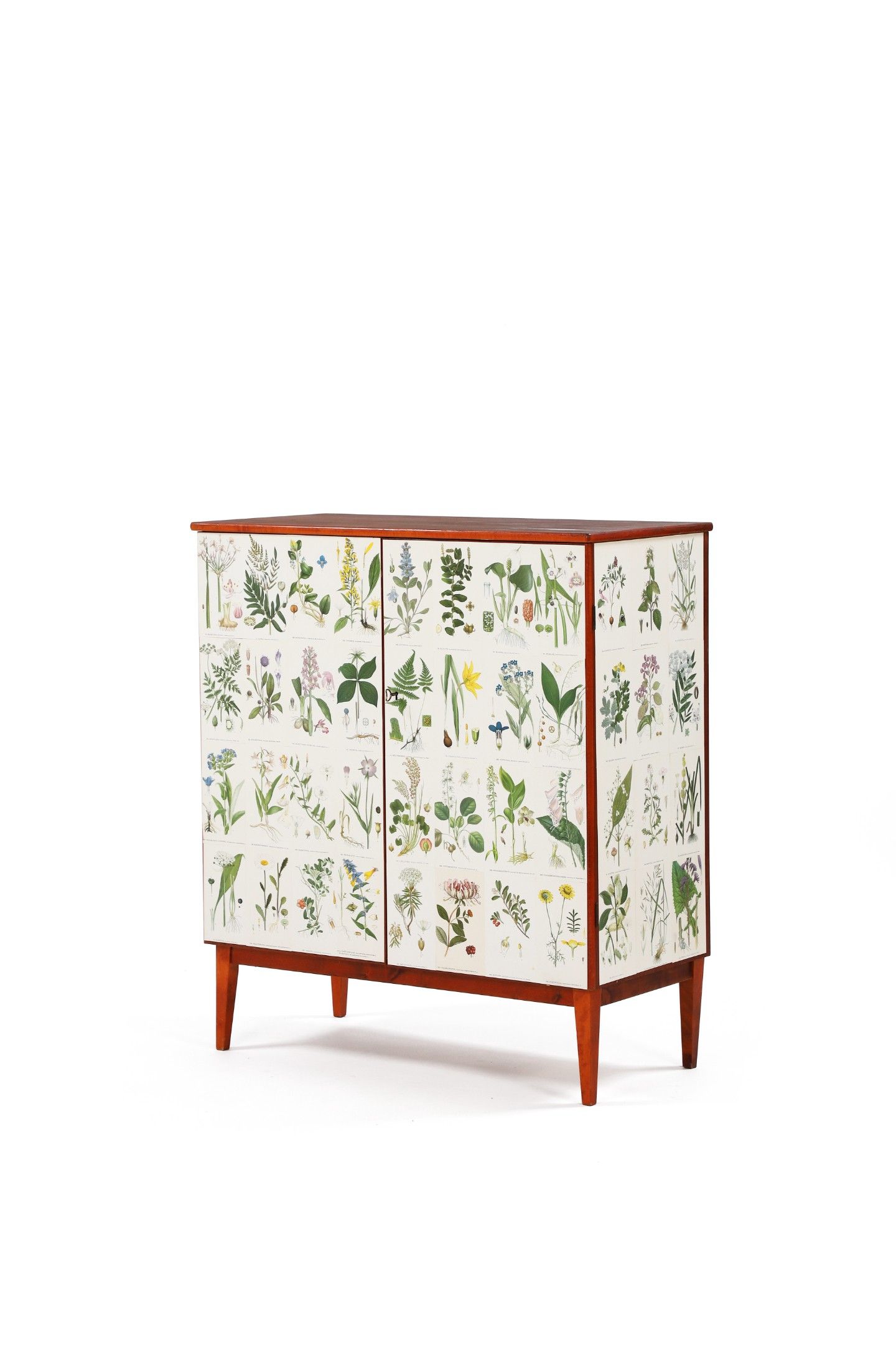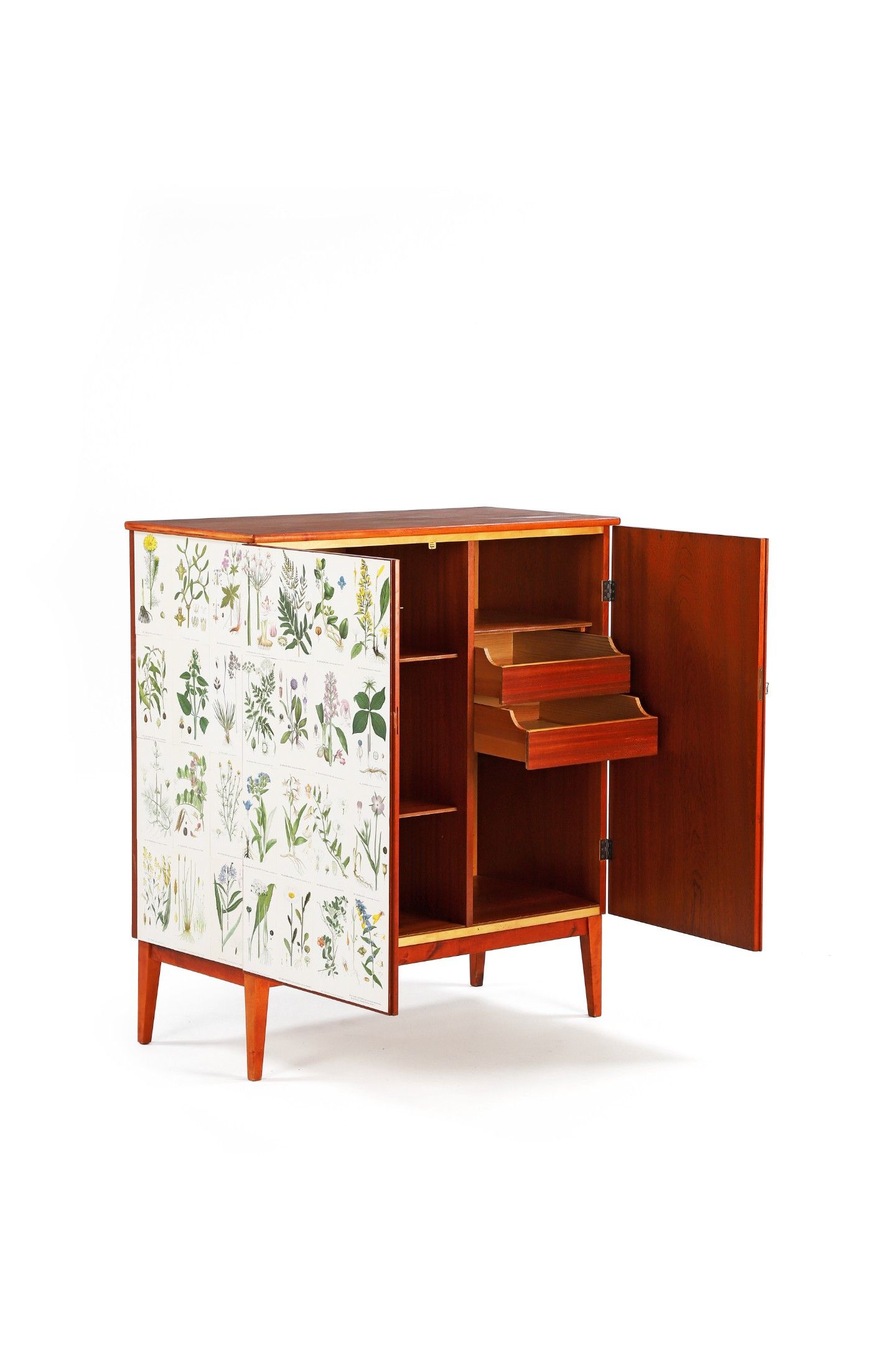 A cabinet, c. 1950, teak structure, covered with floral wallpaper.