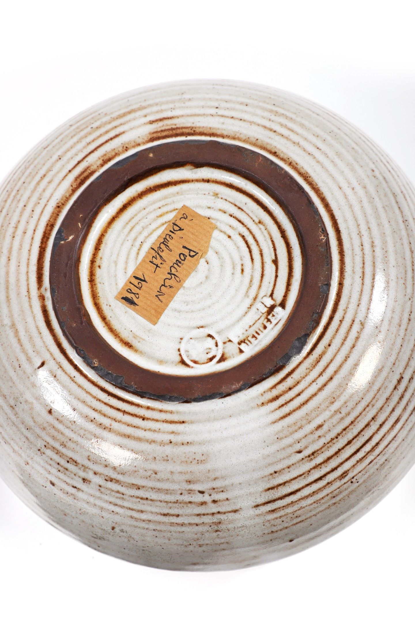 A chamotte clay vase, grey and beige enamels on brown background. Stamped.