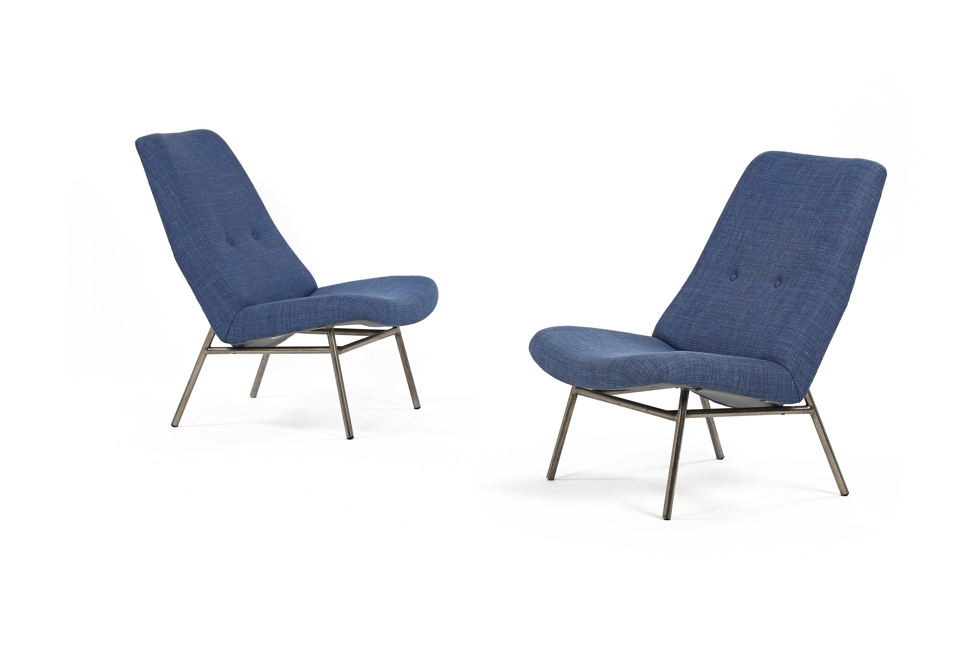 A pair of 'SK660' armchairs, model designed c. 1953, structure re-covered with foam later upholstered in blue tweed, chrome-plated metal feet.
