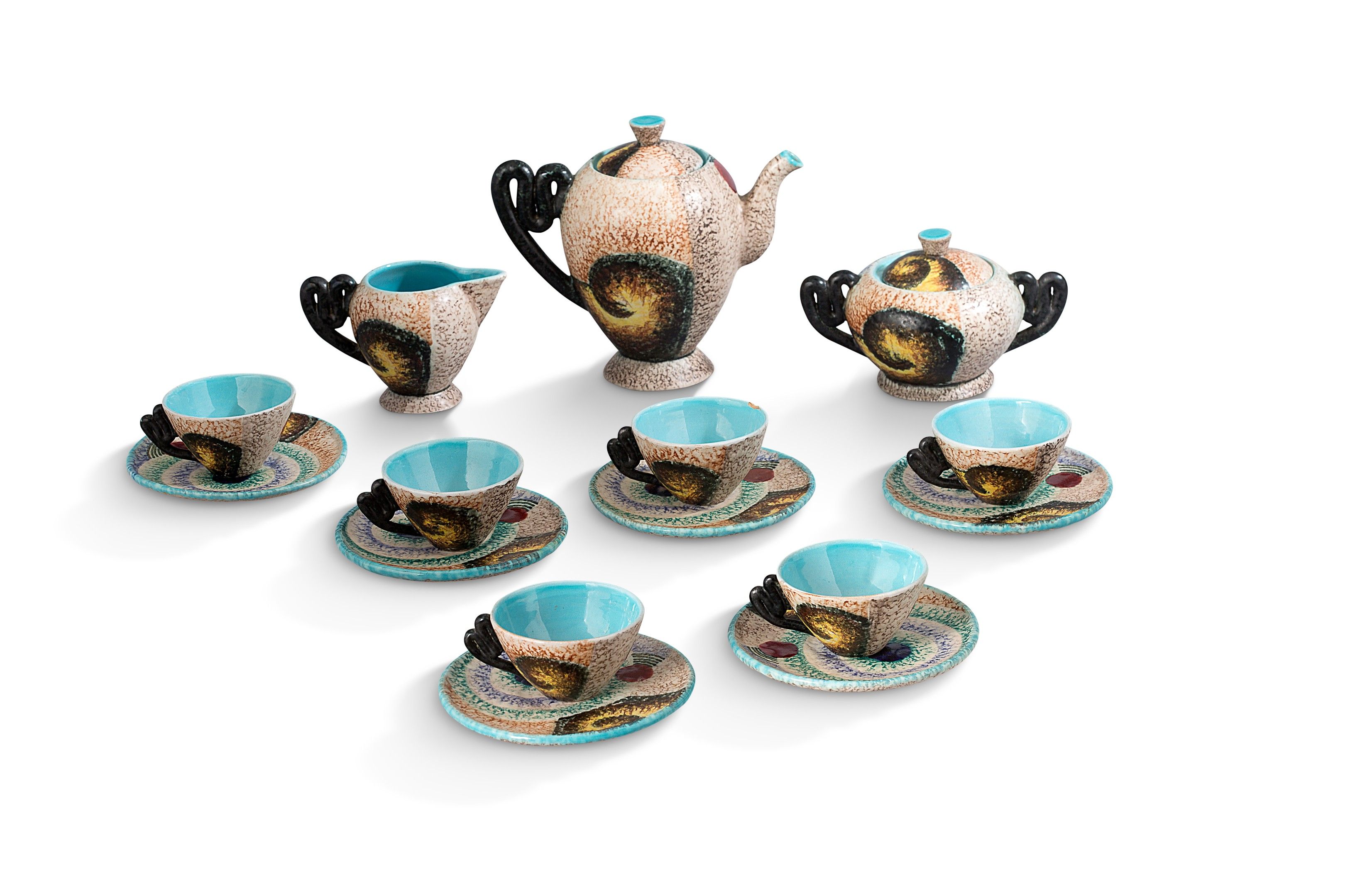 Ceramic, with futuristic polychrome enamel decoration, comprising a coffee pot, a milk jug, a sugar bowl, six cups and their saucers.