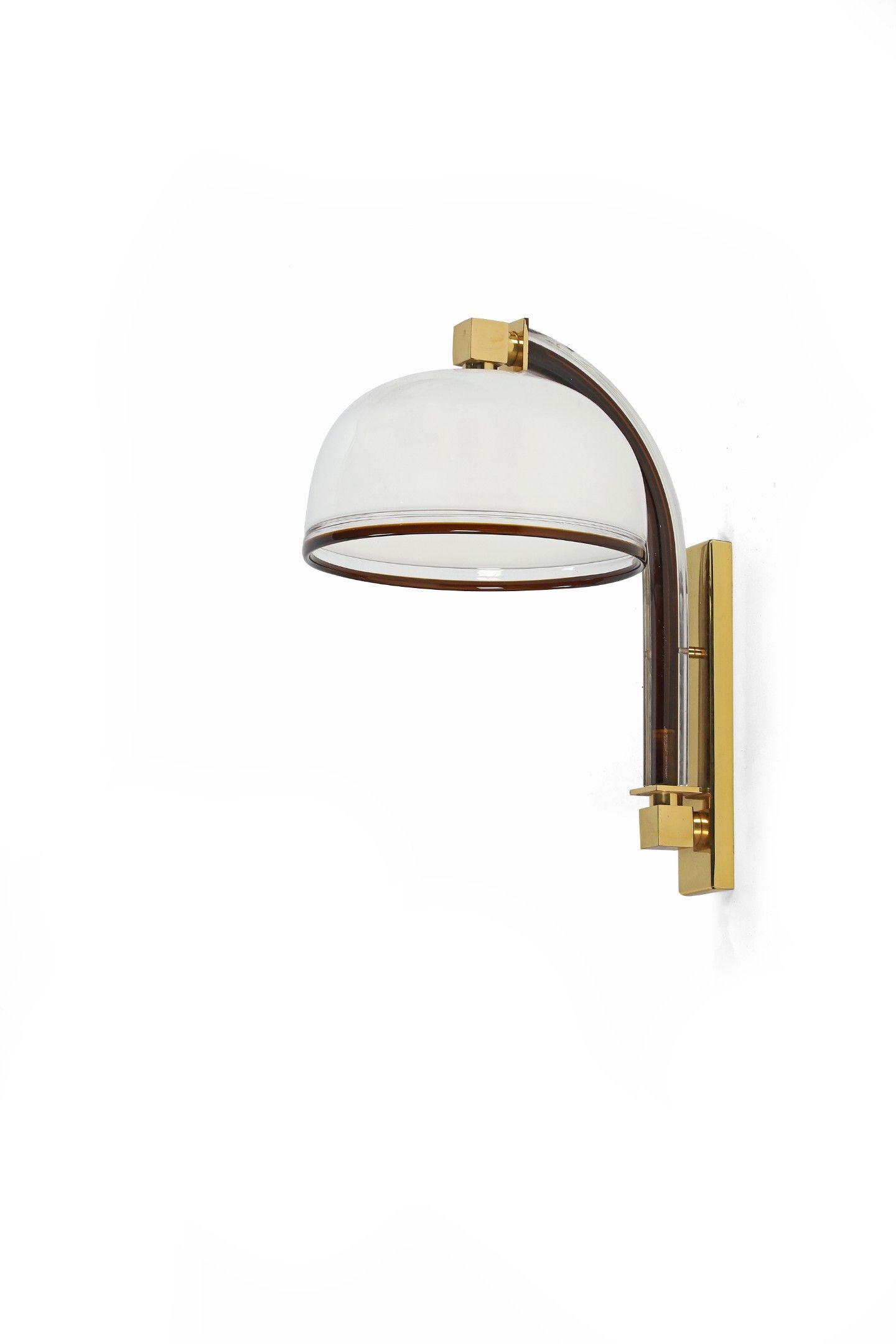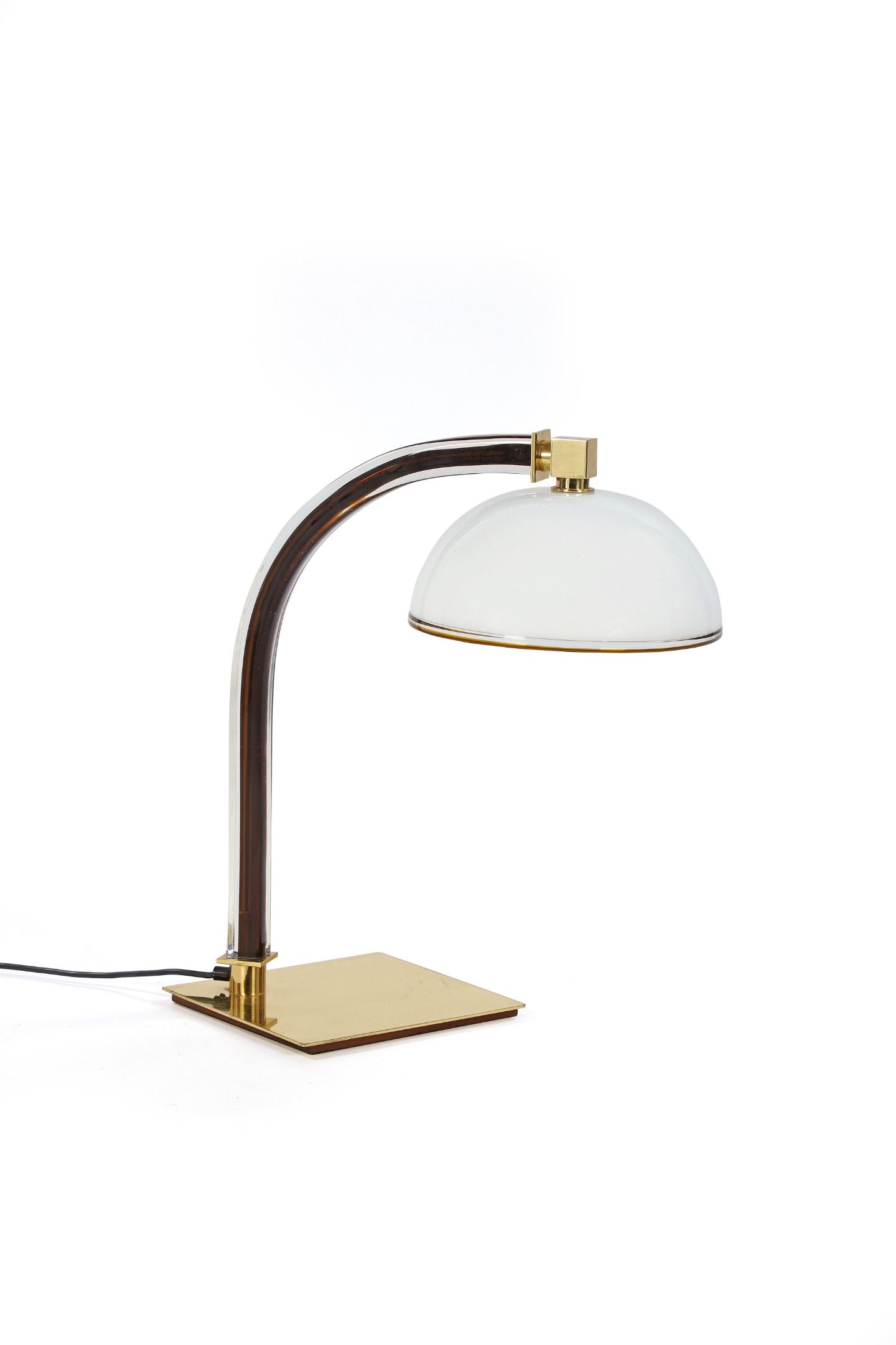 A set of a desk lamp and a wall lamp, brown tinted and translucent glass stem, white opaline glass deflector, brass mount. Signed.
