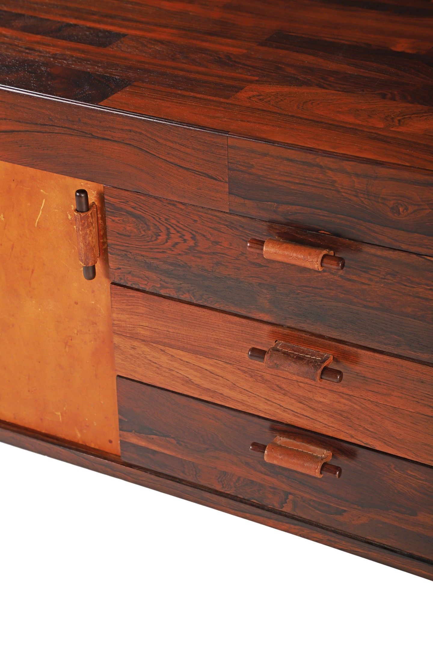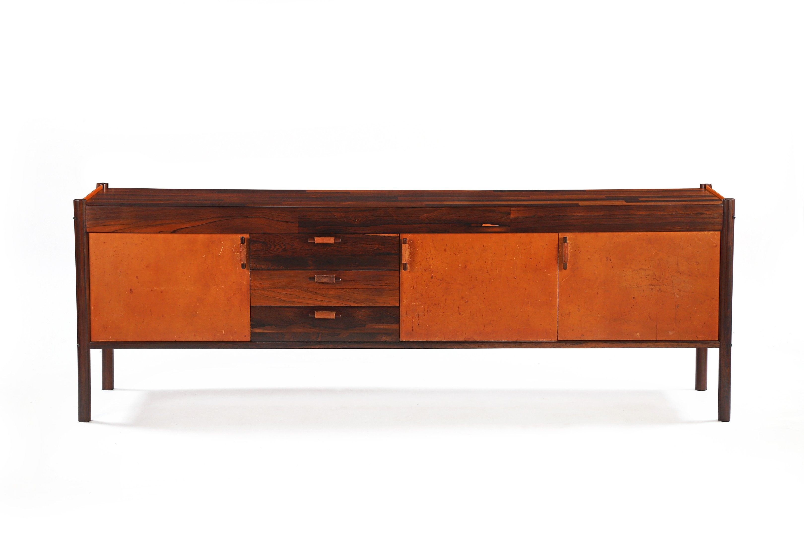 A sideboard, jacaranda and re-varnished jacaranda veneer structure, sides and doors covered in tan leather. Producer's labels.