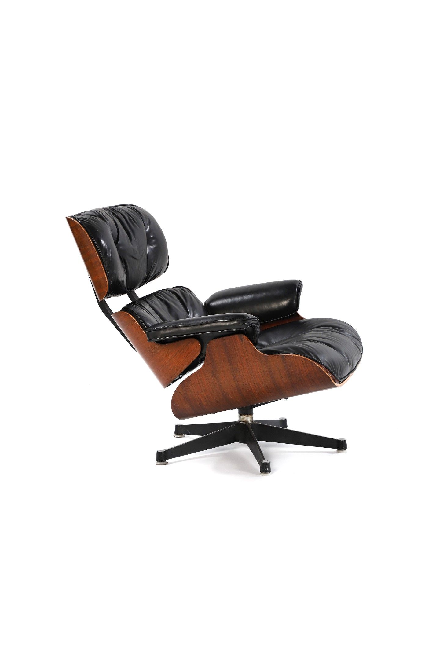A swiveling armchair, model '670' also known as the 'Lounge Chair' designed in 1956, rosewood plywood structure, seat and backrest cushions covered with original black leather, black lacquered aluminum feet.