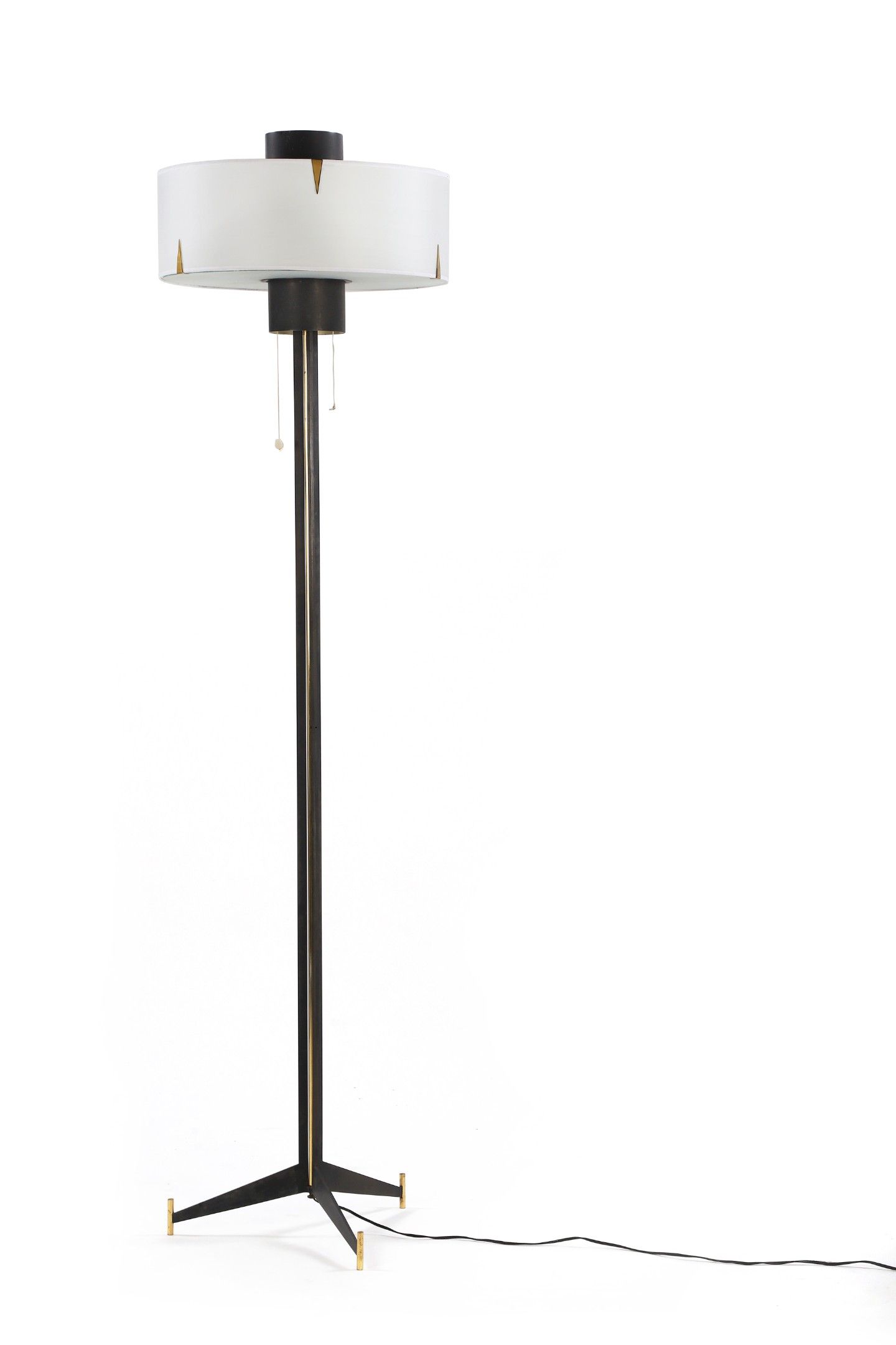 Black lacquered metal structure, cruciform shaft enclosing a brass cylinder, cylindrical white rhodoid lampshade with brass spikes holding an opaline glass slab forming a bulb cover, standing on a tripod base with brass shoes.