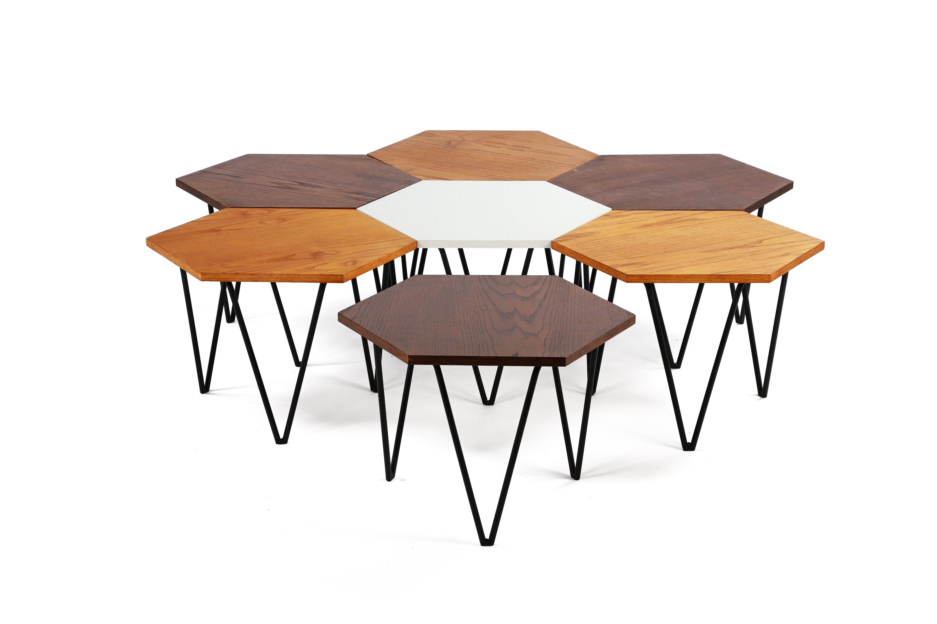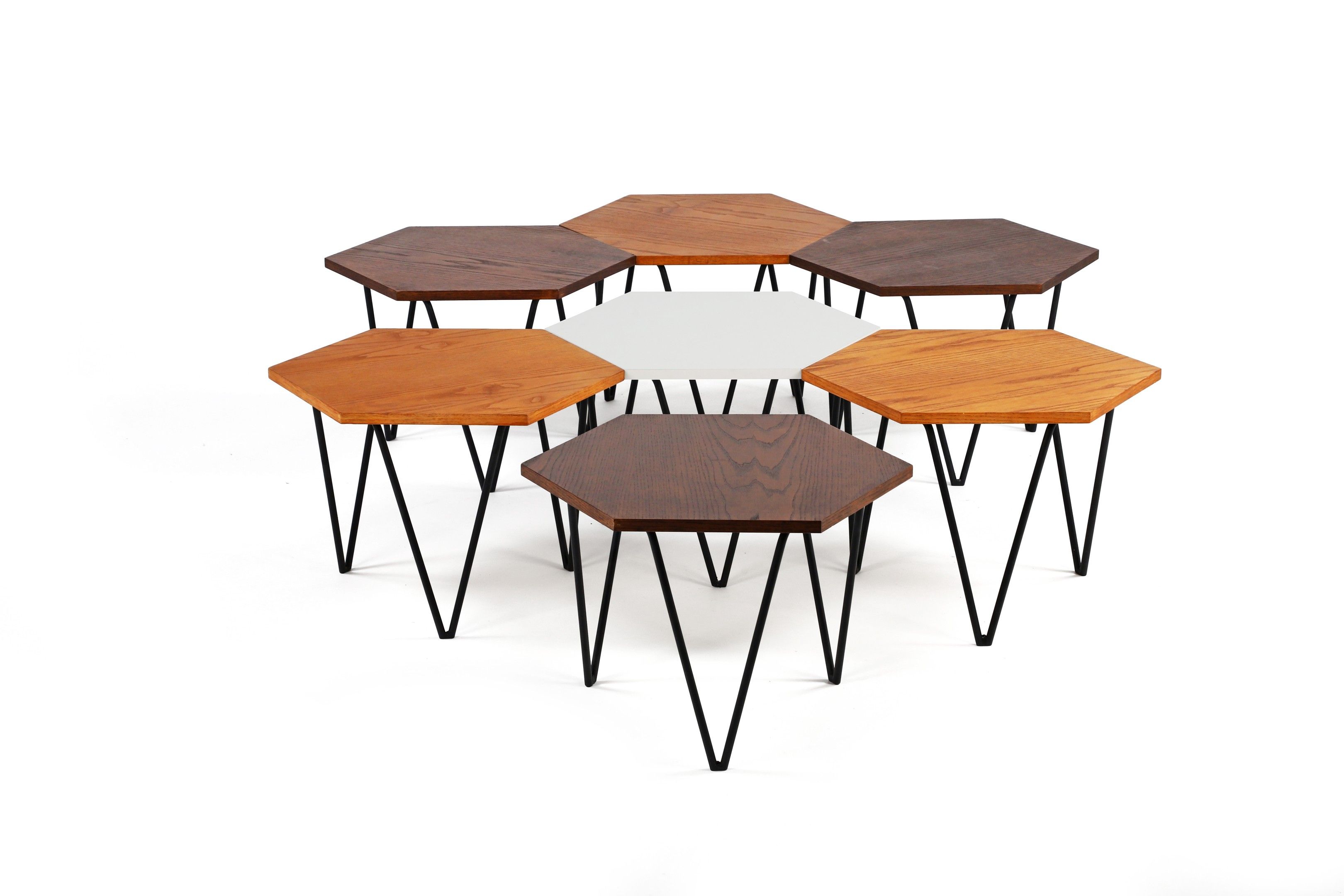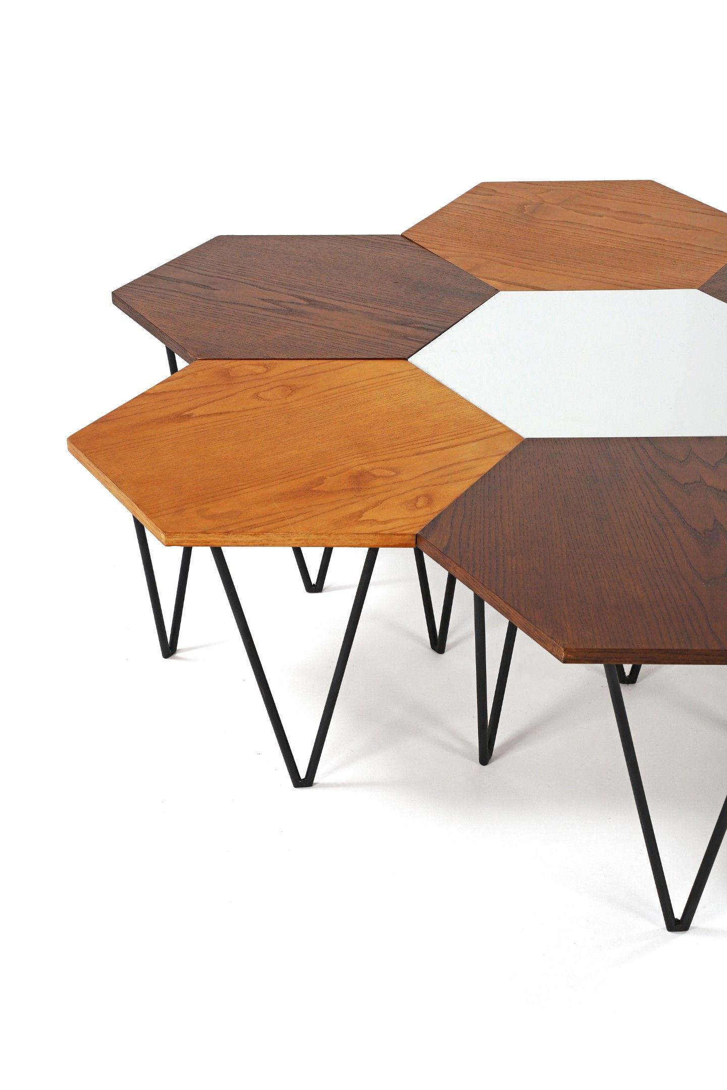 Hexagonal tops, one in white melamine, three in natural ash veneer, three in brown stained ash veneer, black lacquered metal tubular legs.