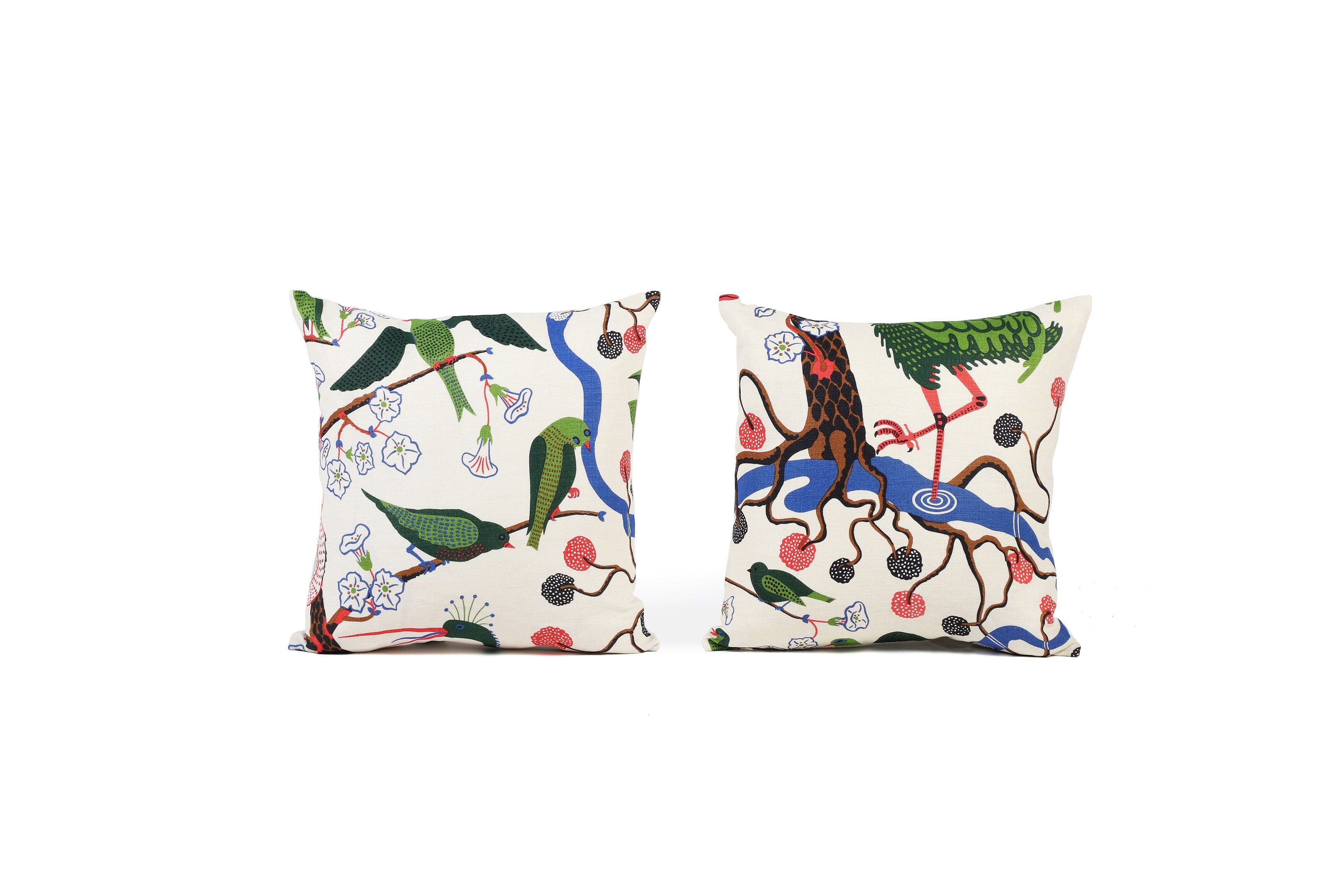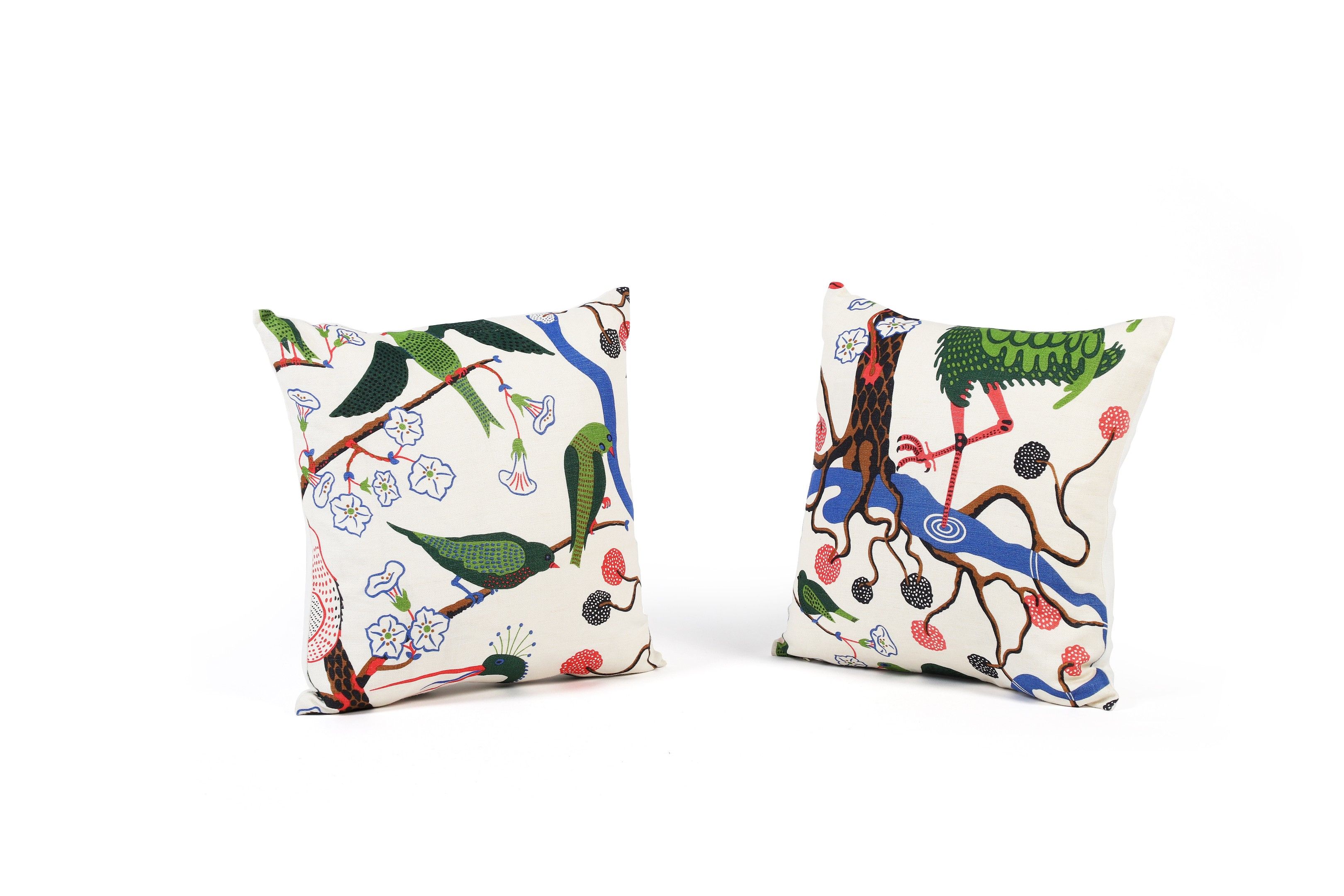 Pair of cushions, polychrome linen cover with 'Green birds' motif, down filling.