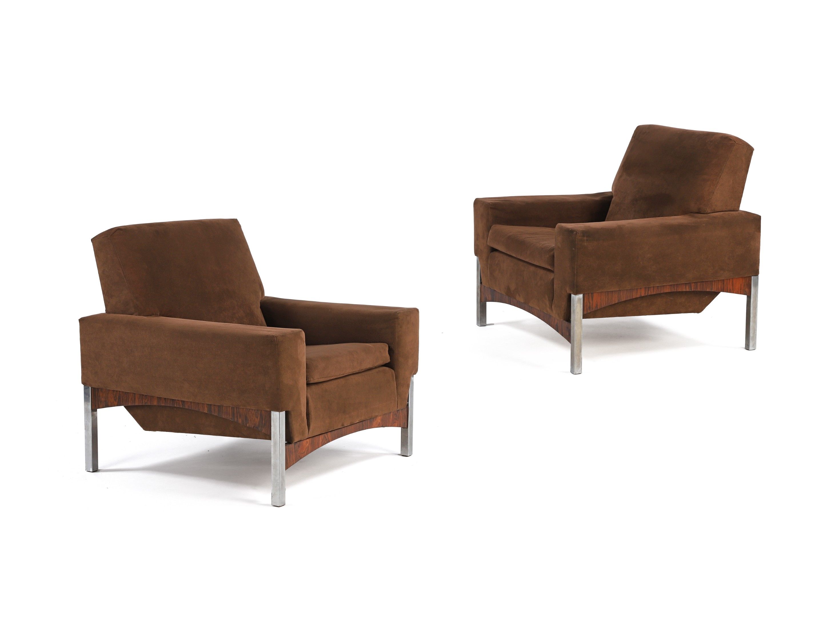 A pair of large armchairs, c. 1960, structure covered with foam upholstered in suede, rosewood veneered rails, metal feet.