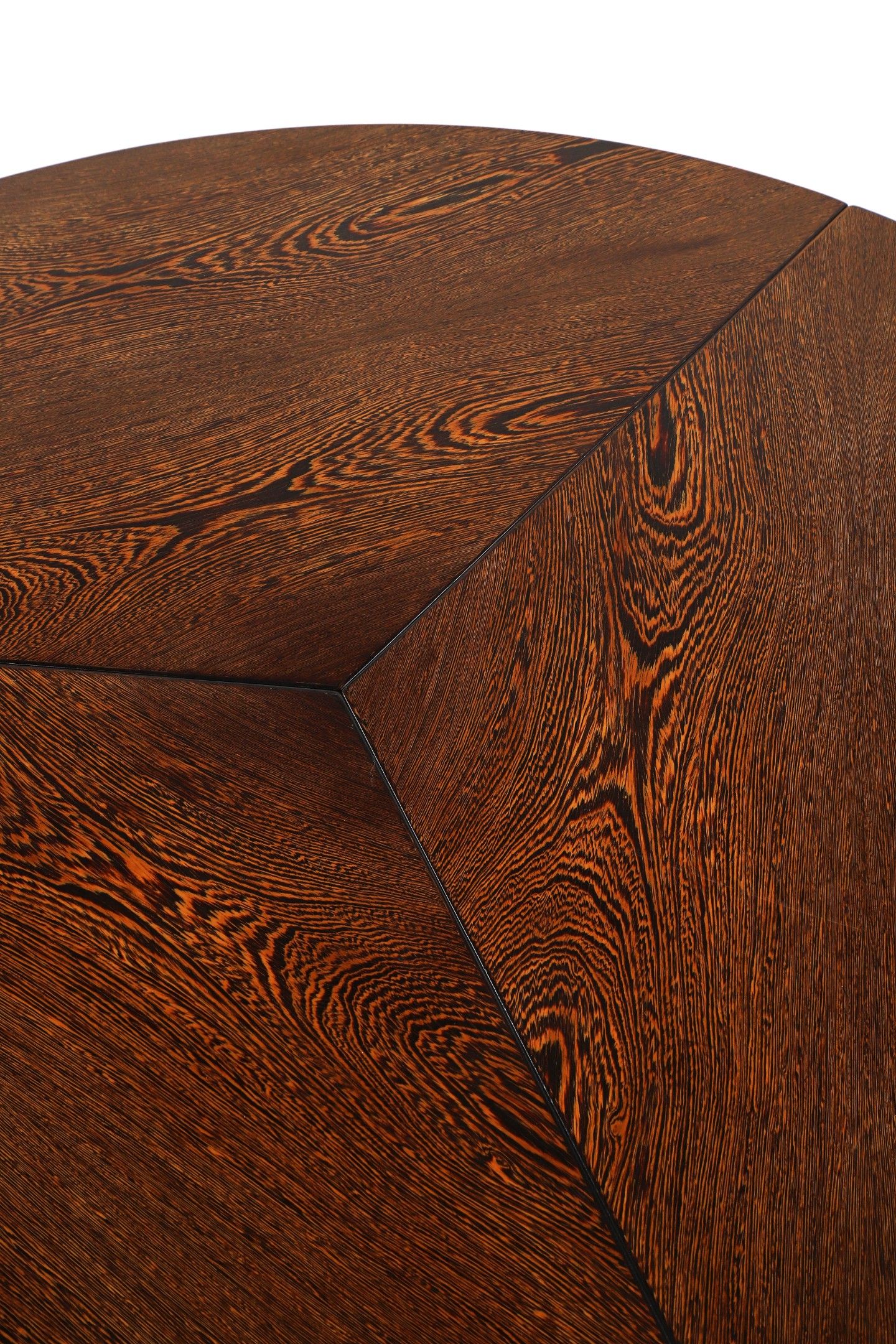 Thick circular top in wenge and wenge veneer, consisting of three segments, resting on a tripod base in black lacquered wood.