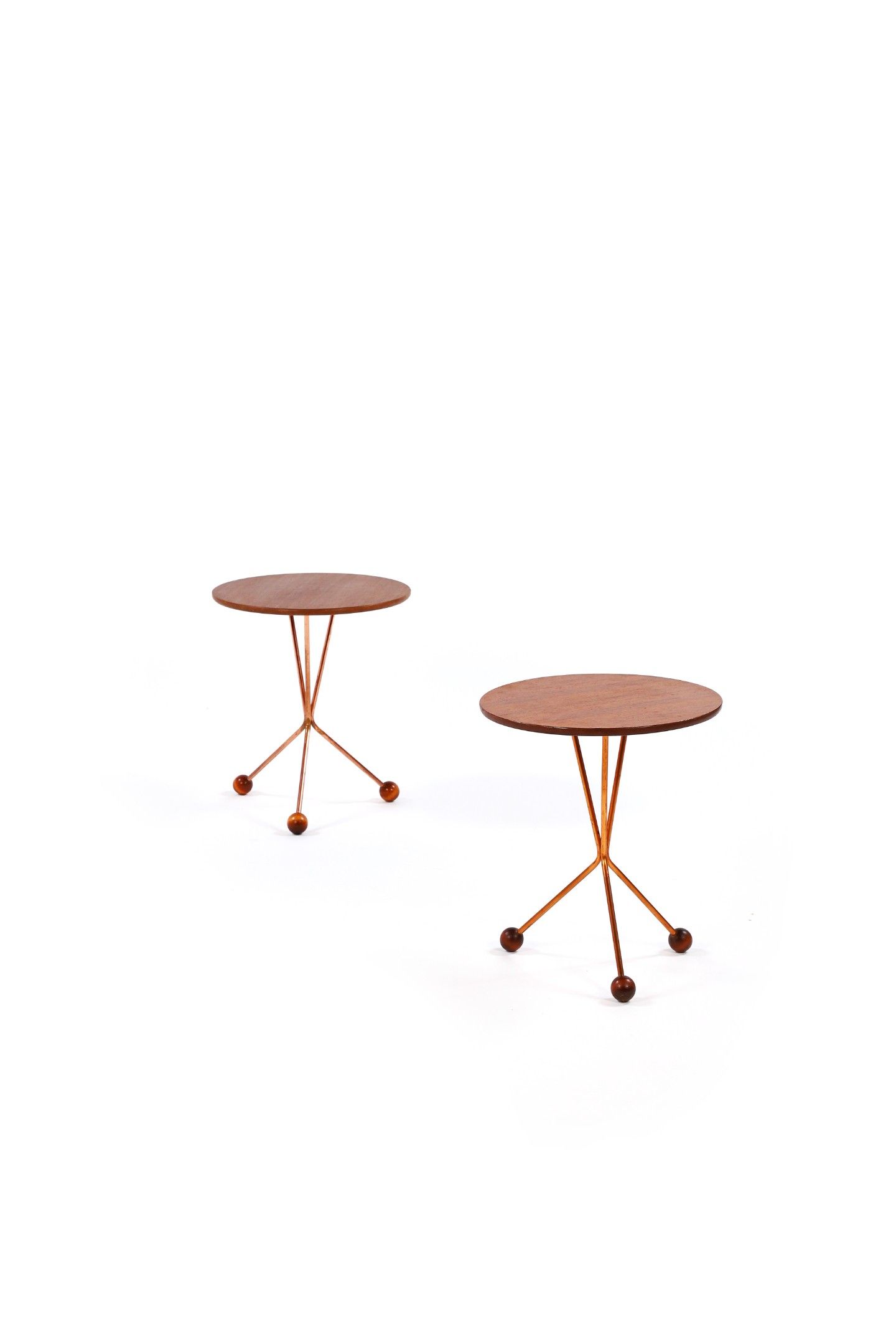A set of two side tables, model '99', circa 1955 - 1960, tinted teak top, tripod copper base on three wooden spheres.