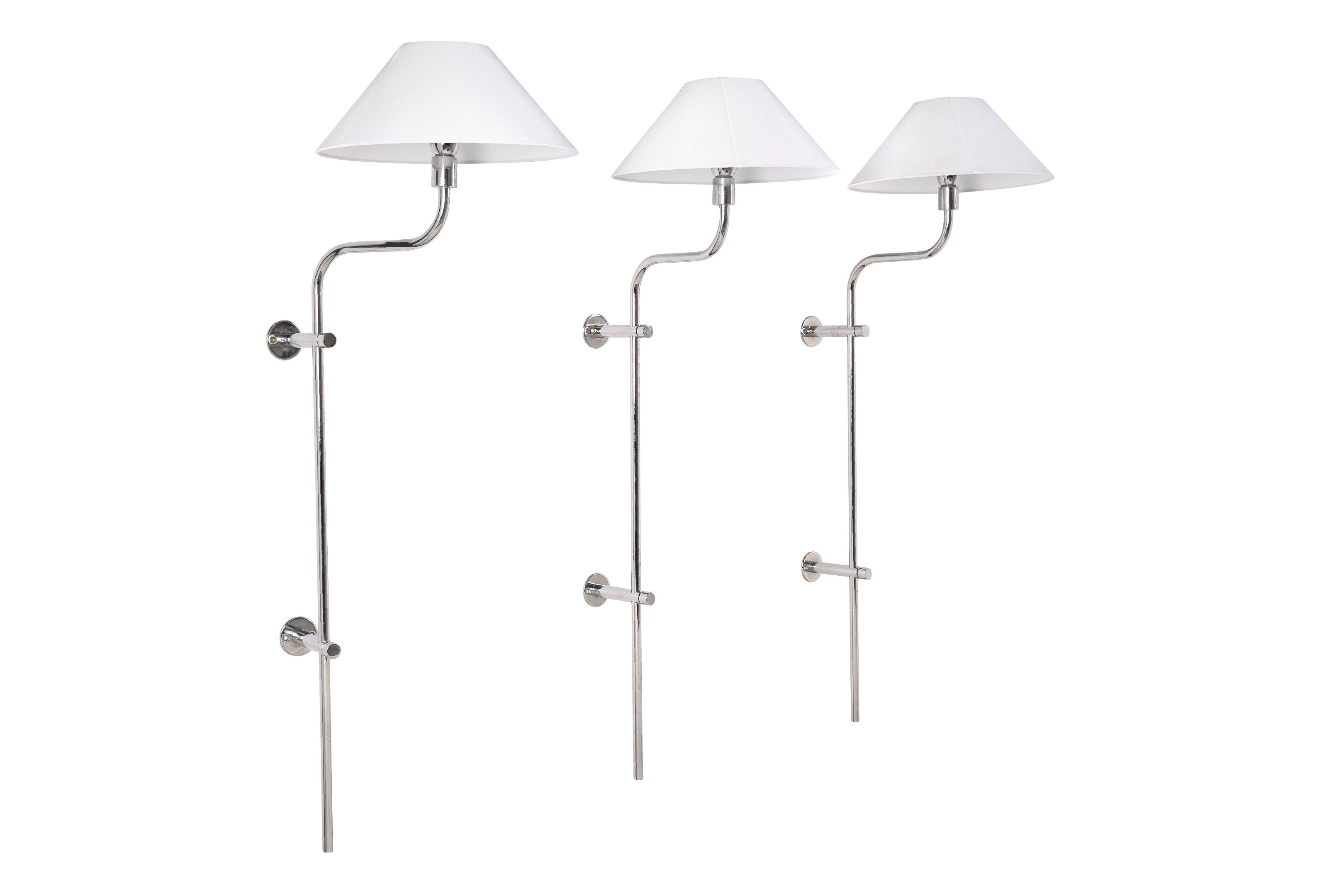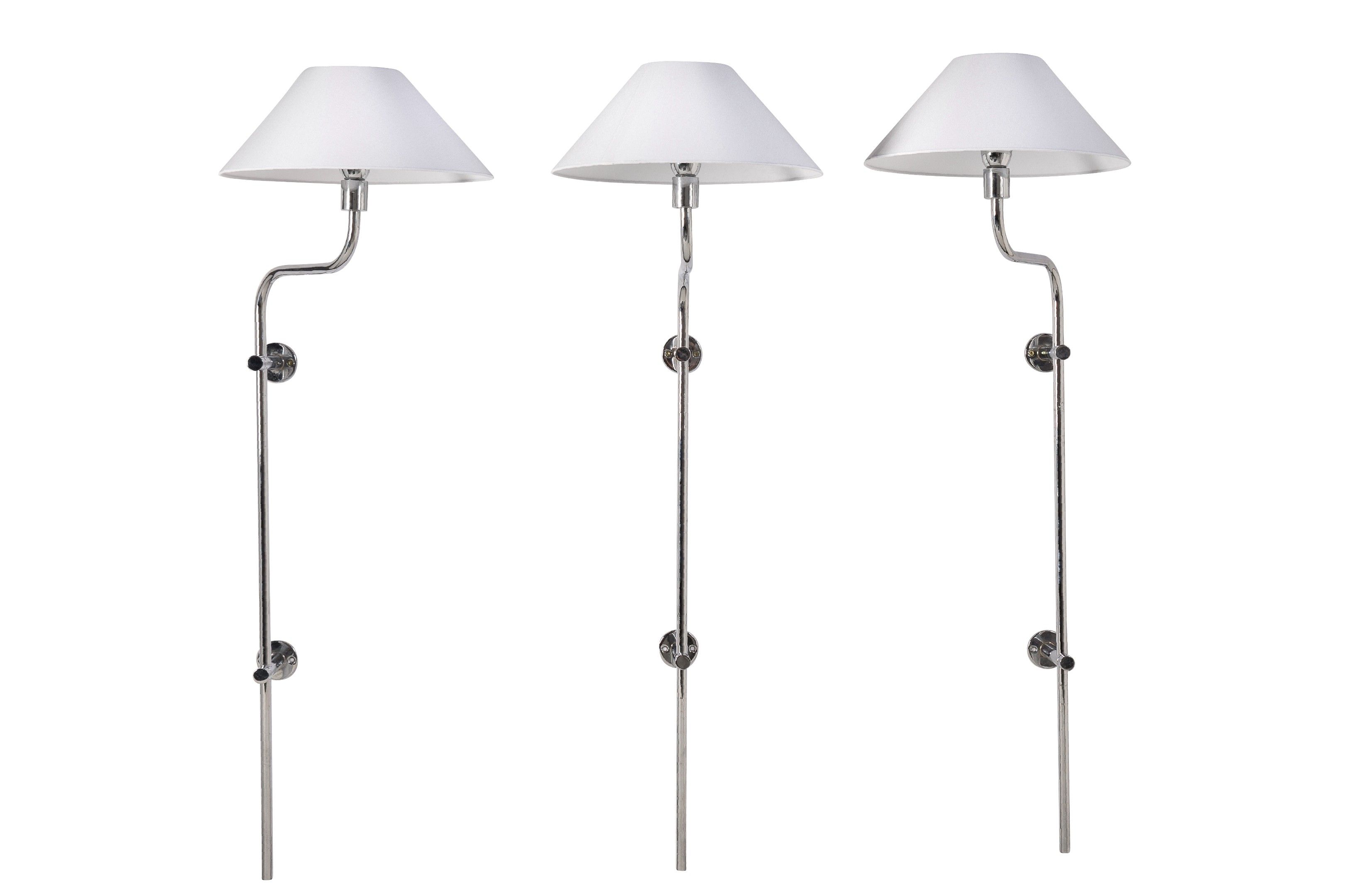 A set of three wall lamps, chromed metal tubular stem, white cotton lampshade.