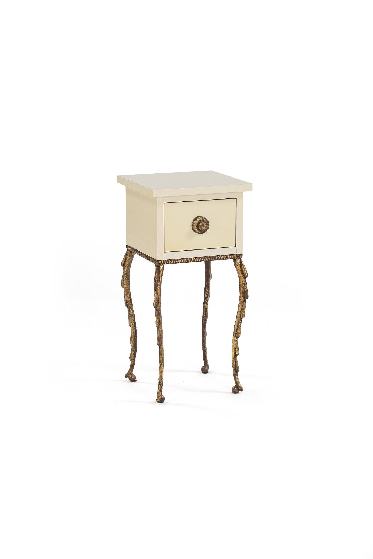 Quadrangular body in ivory lacquered sycamore, opening with a drawer at the front, bronze handle with bronze patina, resting on a four-legged base in bronze with bronze patina.