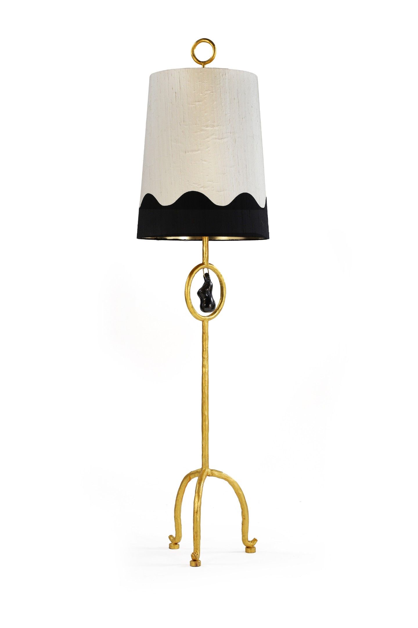 Structure in wrought iron entirely gilded with gold leaf, shaft topped by a circular socket with a ring in the centre adorned with a suspended element in black glazed ceramic, resting on a tripod base, original lampshade in two-tone beige and black silk.