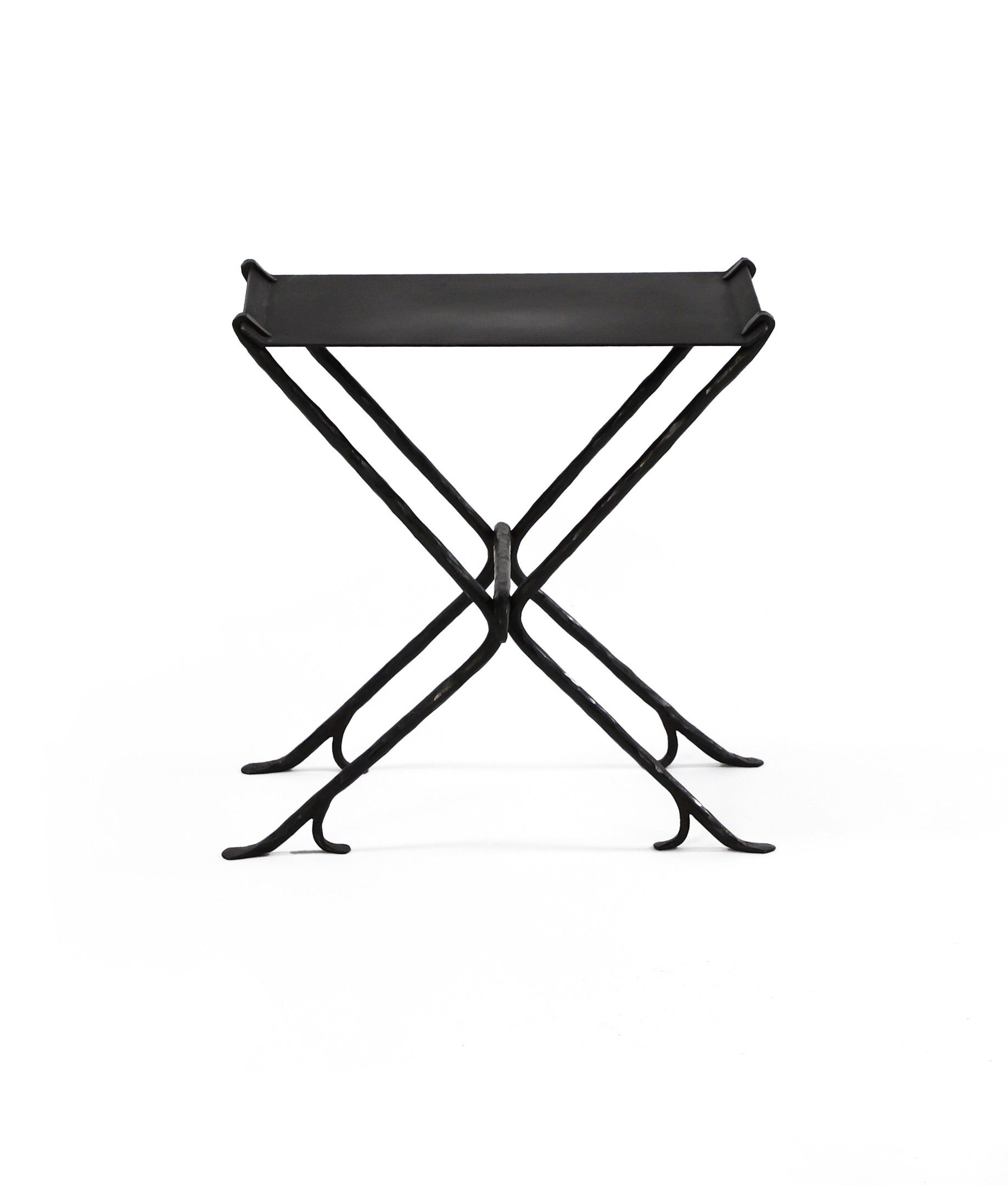 Wrought iron X-leg supporting an oxidised iron top with black and brown patina.
