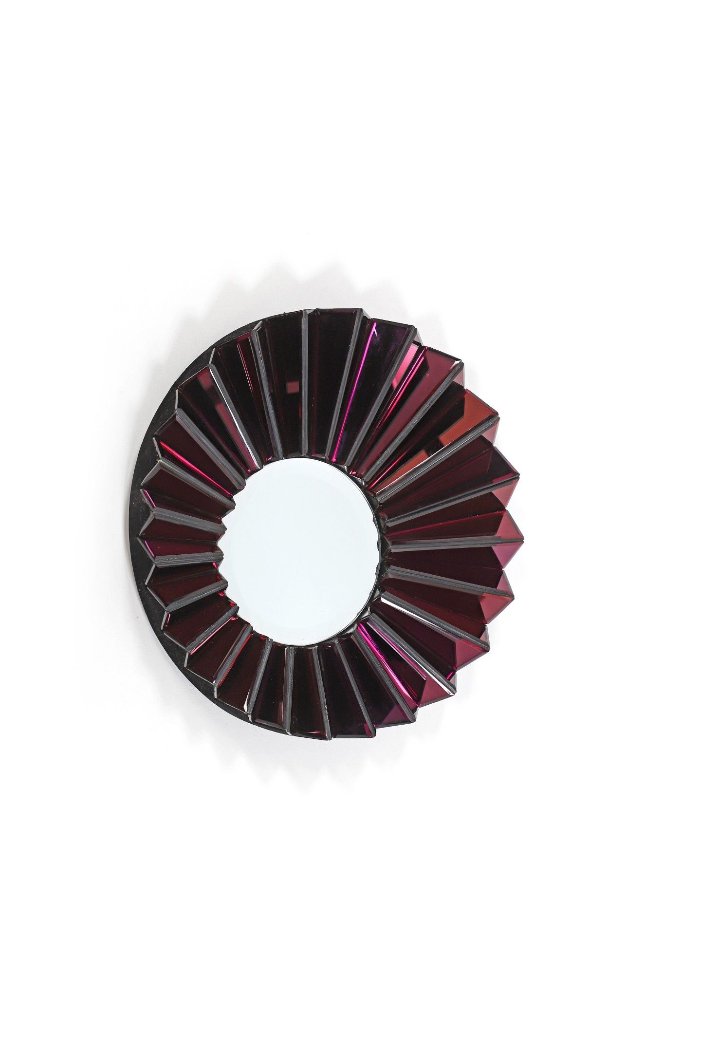Bevelled chevron frame in purple-tinted plexiglass housing the off-centre bevelled circular mirror, the border and back covered in black velvet.