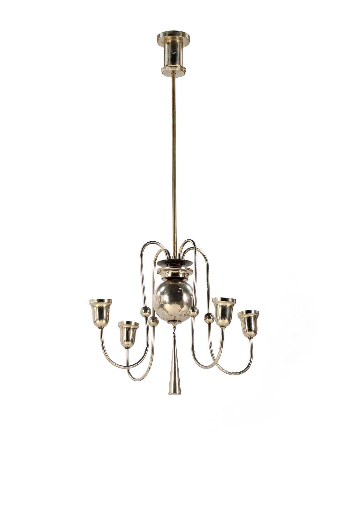 Chromed metal structure, spherical shaft supporting four scrolled arms and a lower triangular pendant.