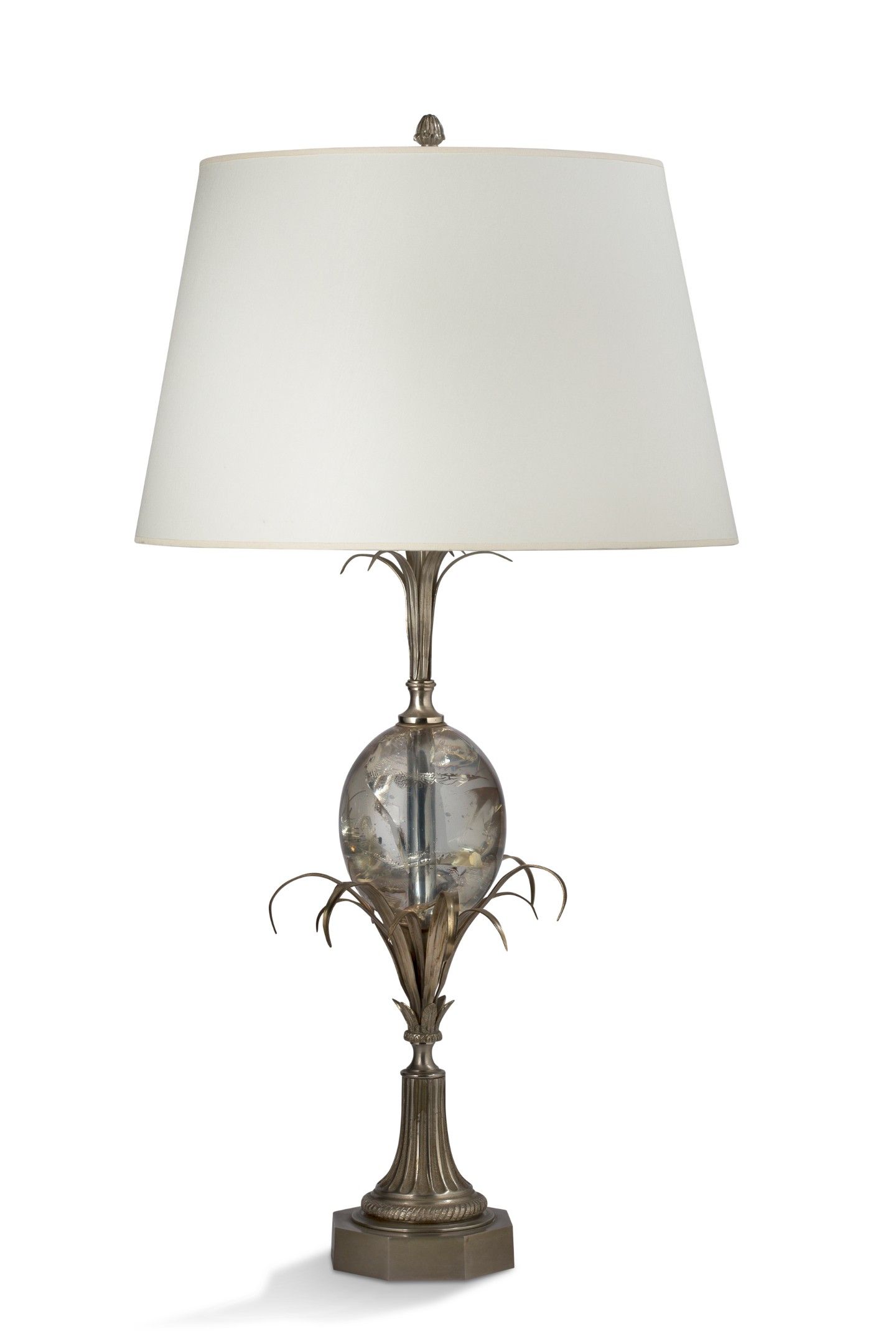 In gunmetal with a gunmetal patina, the shaft decorated with an egg in fractal resin resting on an octagonal base, stem ending in a stylised pinecone, shade in white cotton.
