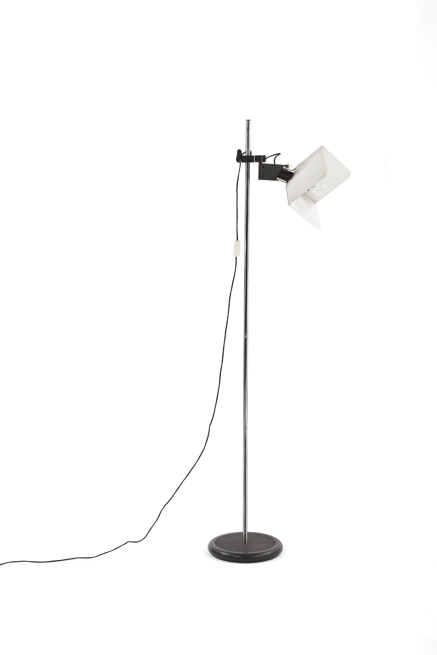 A floor lamp, chrome-plated metal stem, white lacquered metal reflector, black plastic base. Producer's label.