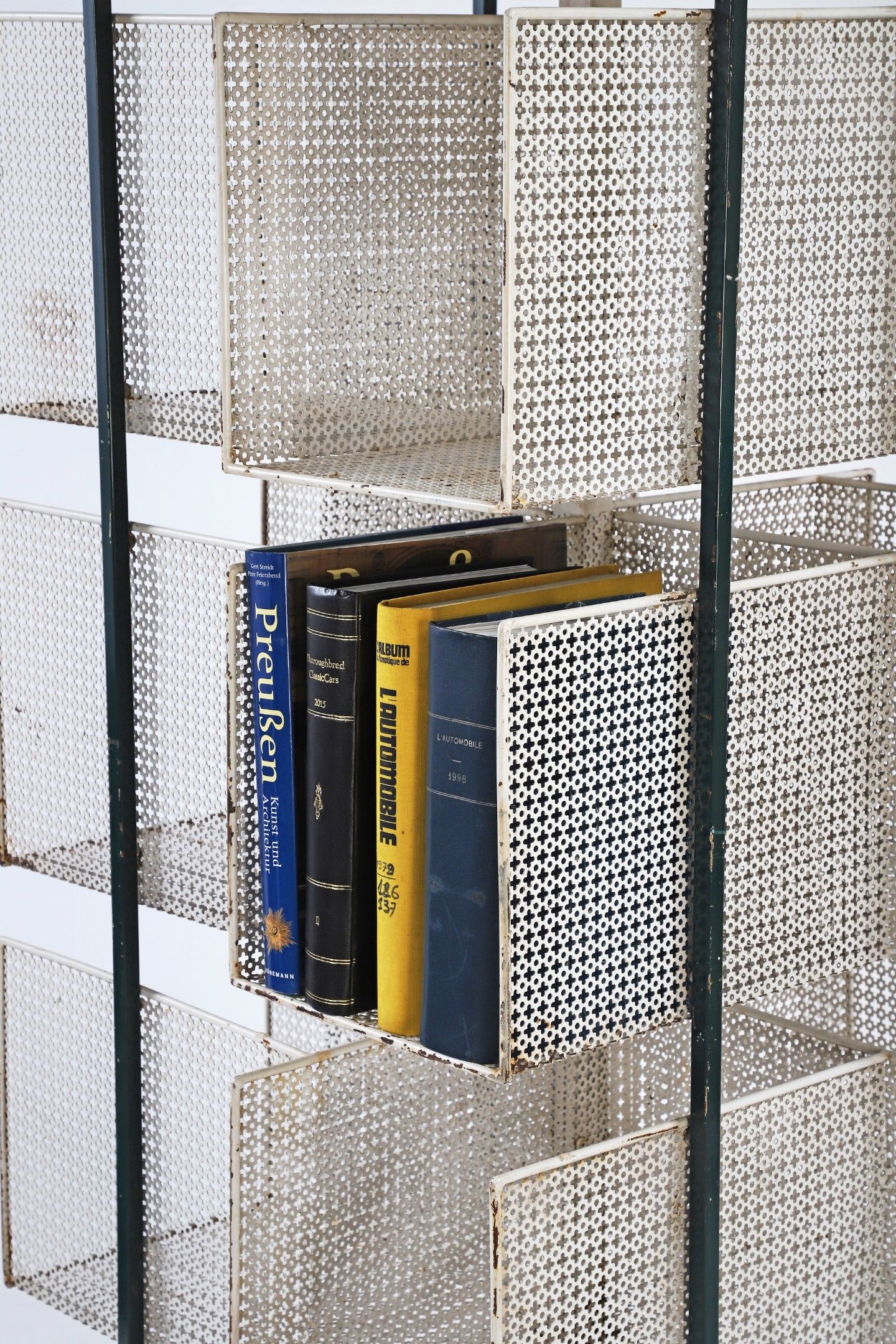 A large pivoting bookcase in white lacquered metal, square-section uprights in green lacquered metal and a circular base in cream and green lacquer.
