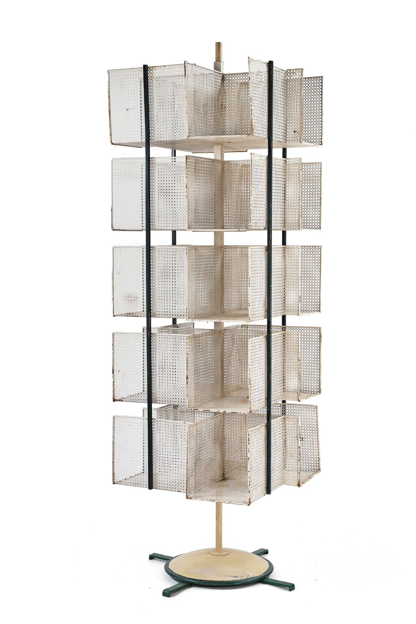 Structure in white lacquered metal, with four columns of five white lacquered trefoil metal compartments around a central axis, with square green lacquered metal uprights on the outside, and a circular base in cream lacquer and green relacquer.