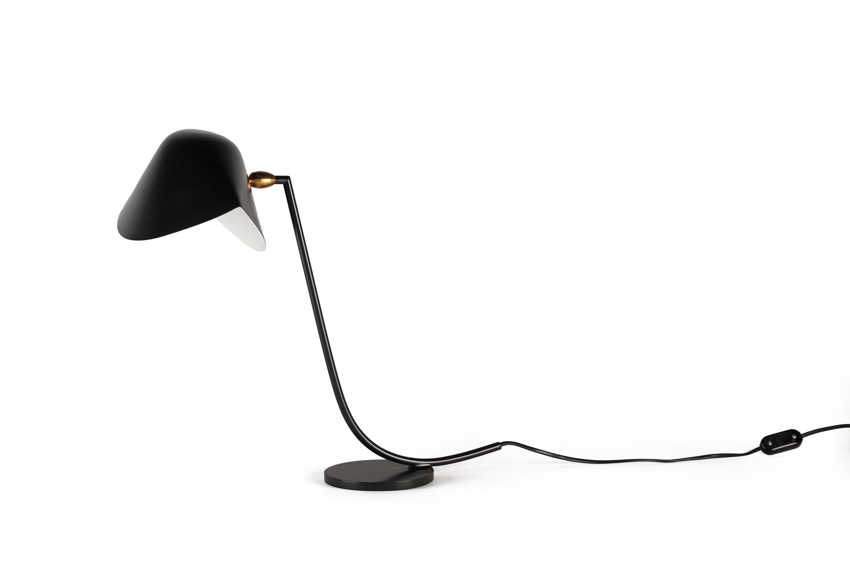 A lamp, model 'Anthony' designed in 1955, black lacquered steel base and stem, black and white lacquered sheet metal reflector, brass ball joint.