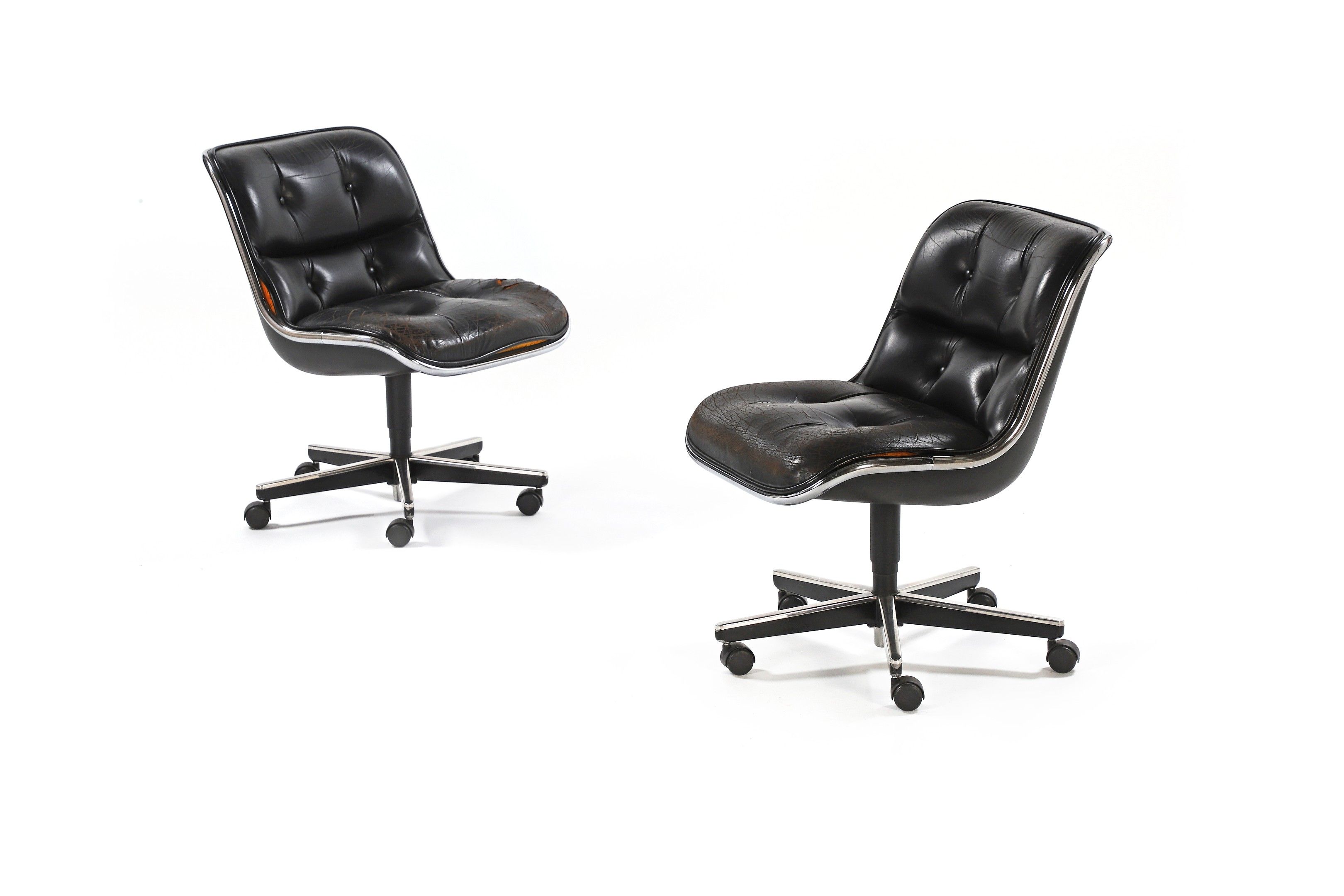 A pair of 'Executive' swivelling chairs, model designed c. 1963, black plastic structure, black leather upholstery, cast aluminium and chromed aluminium base.