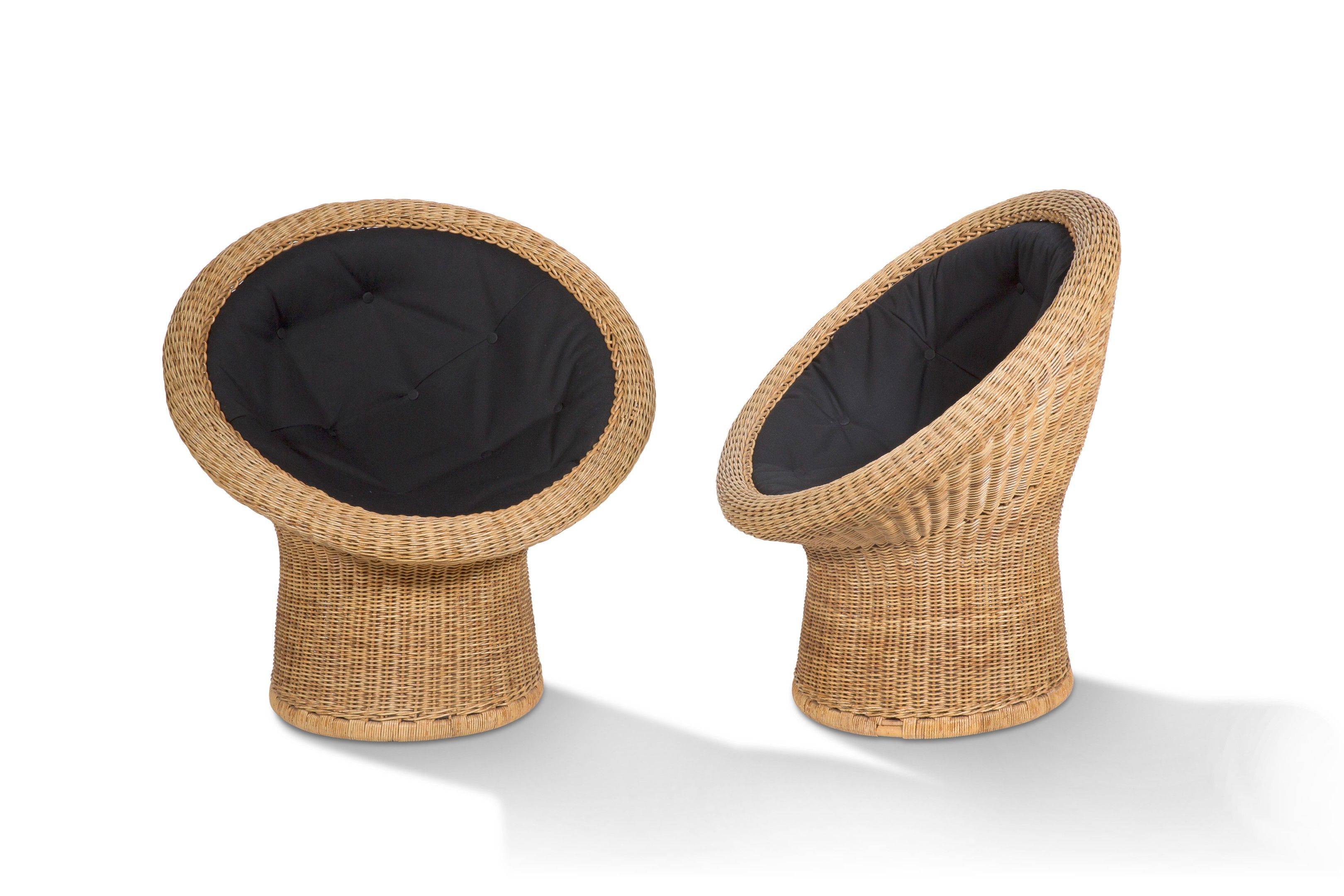 A pair of 'E11' armchairs, designed c. 1967, woven wicker, later black cotton cushion.