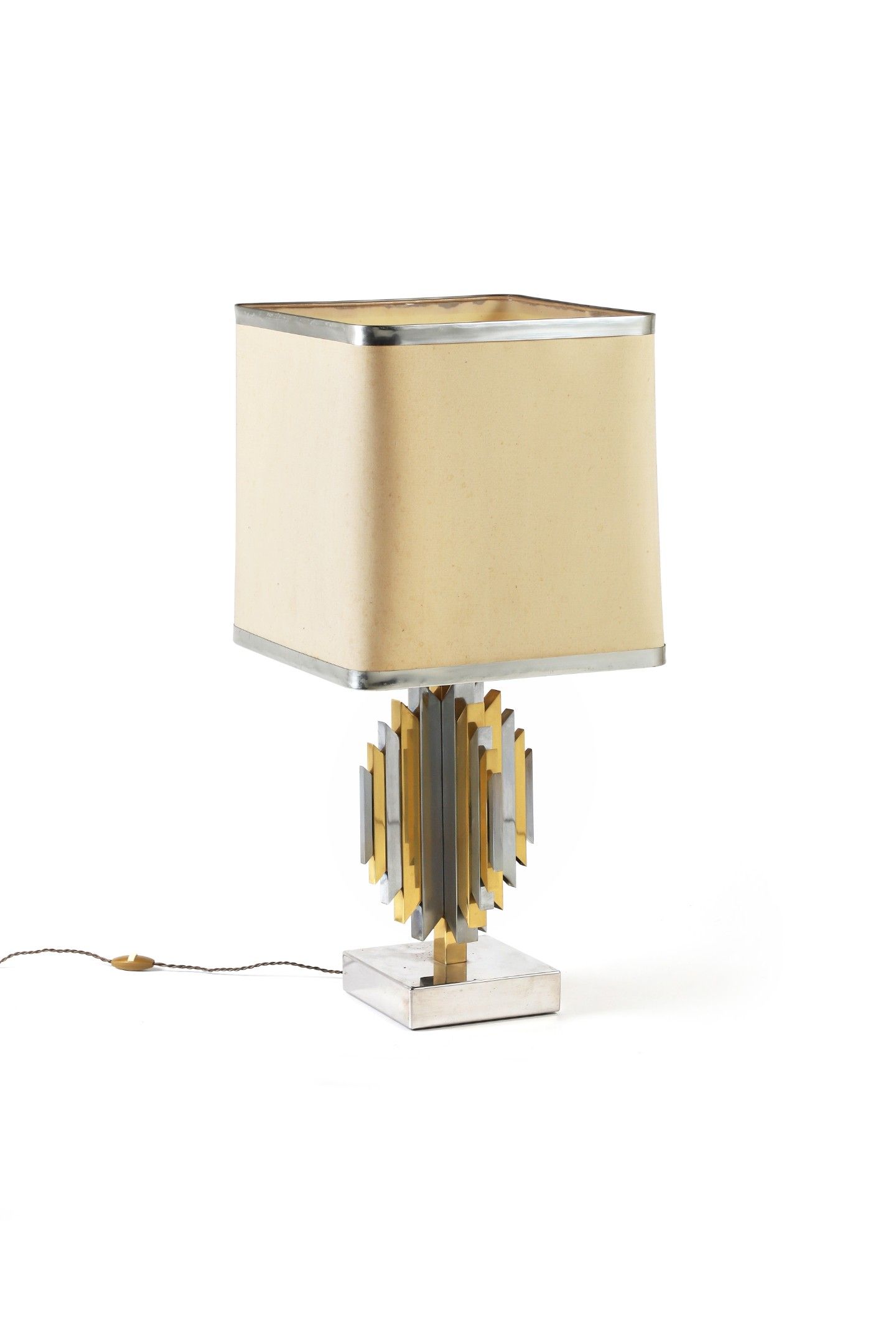 A lamp, c. 1970, chrome-plated metal and gilt brass, beige cotton lampshade, chrome-plated metal base.