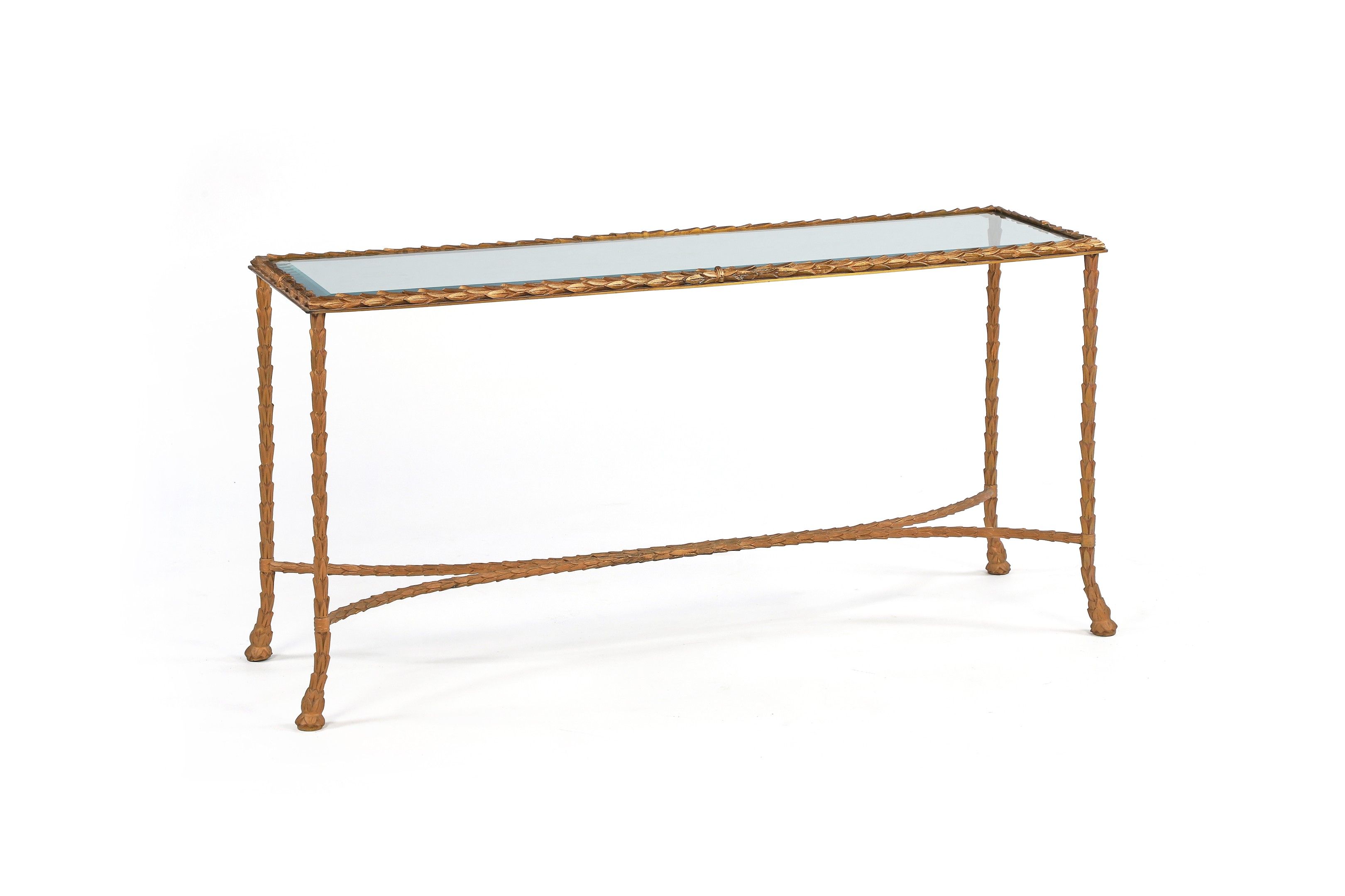 Gilded bronze structure with palm leaf motifs, rectangular bevelled glass top, slightly smoked, four-legged base joined by an X-brace.