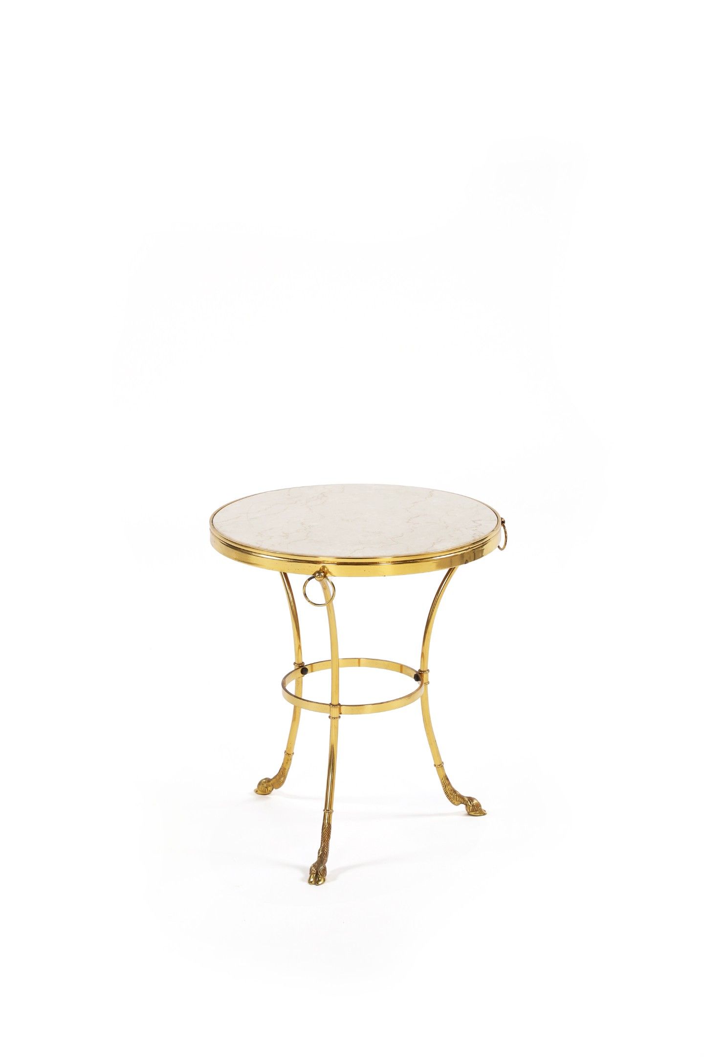 A neoclassical gilt bronze and brass pedestal table, marble top.