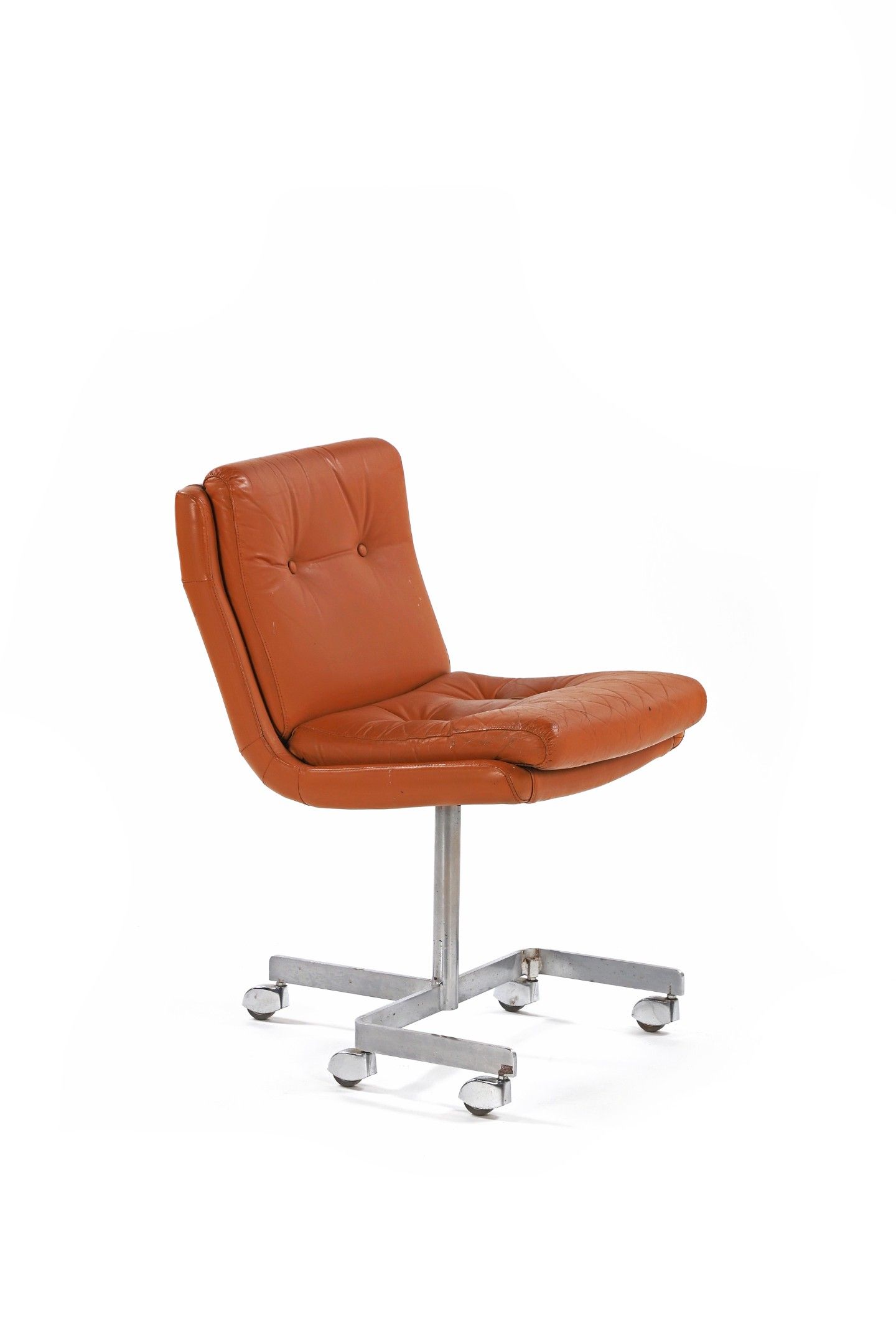 Metal frame, seat and back upholstered in foam covered with cognac leather, chrome-plated metal base forming a stylised Y on castors.
