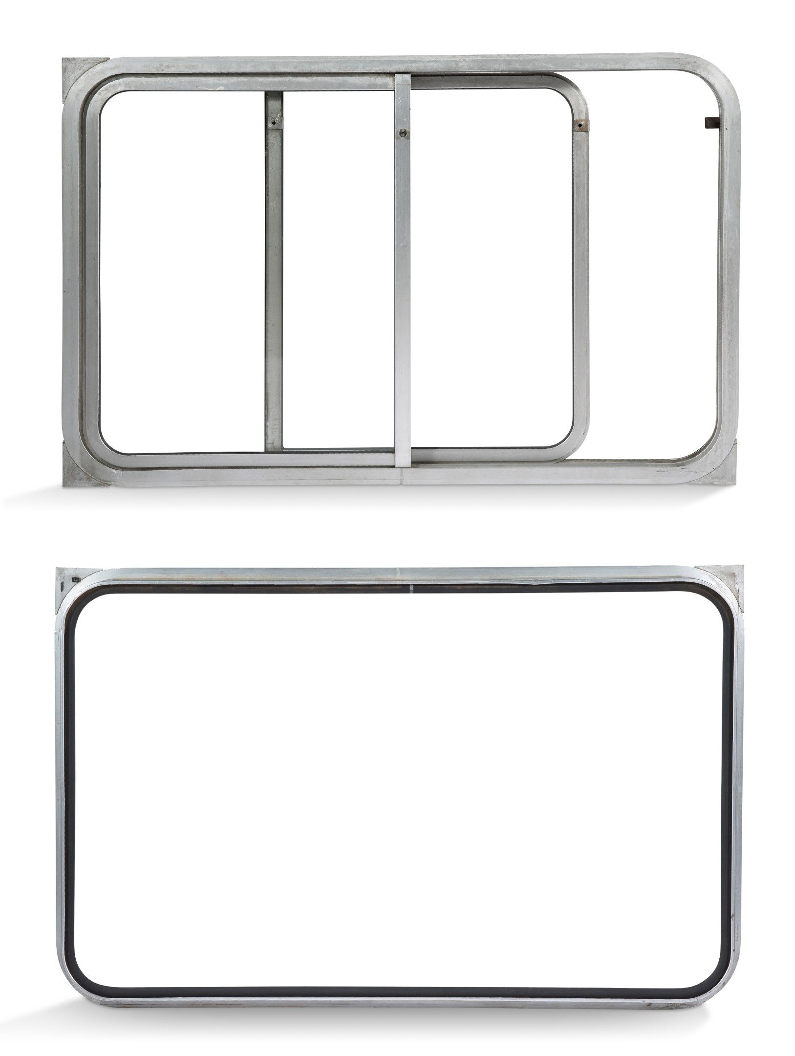 Aluminium and glass, one with fixed glass, the other with sliding glass.