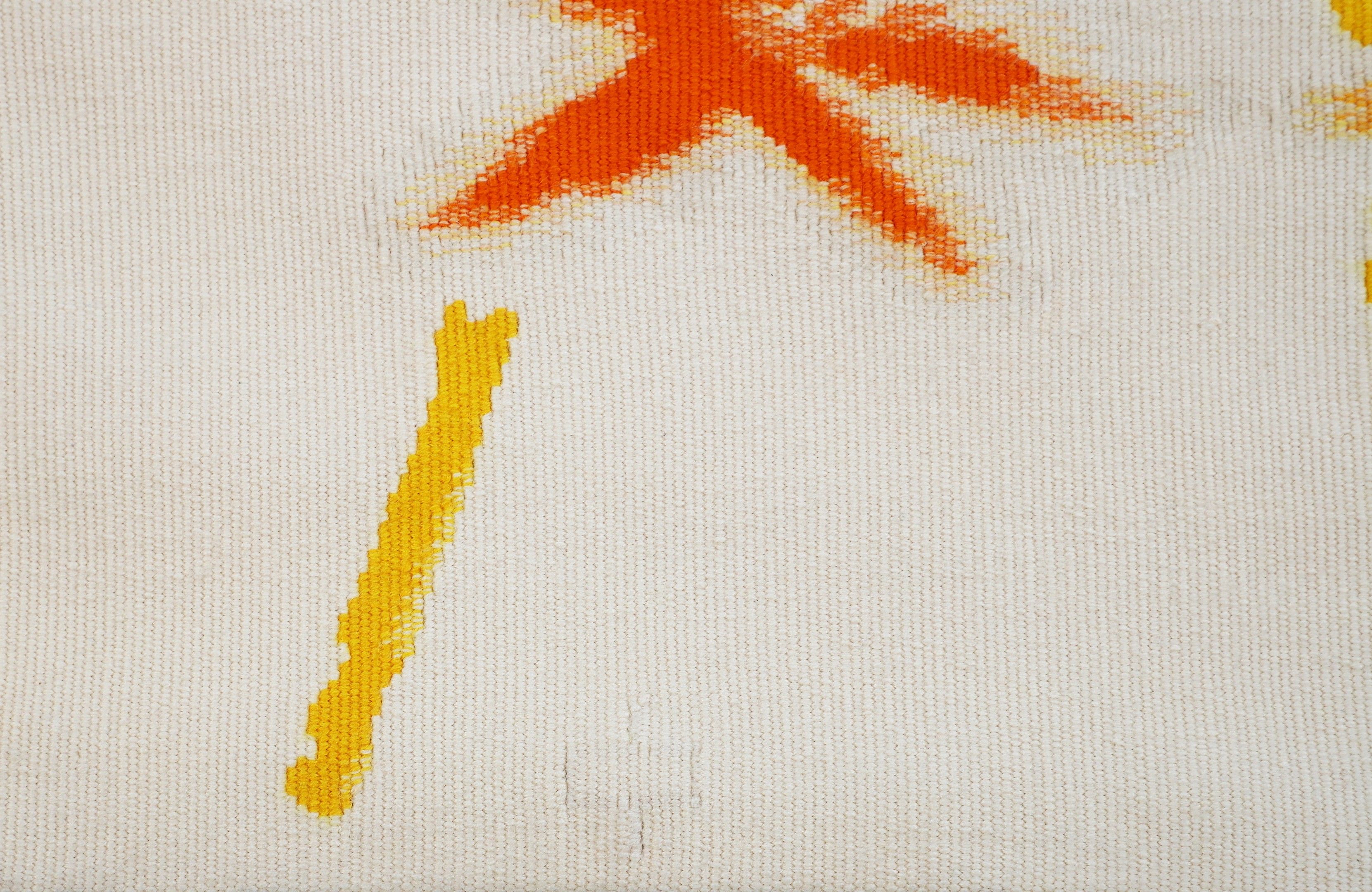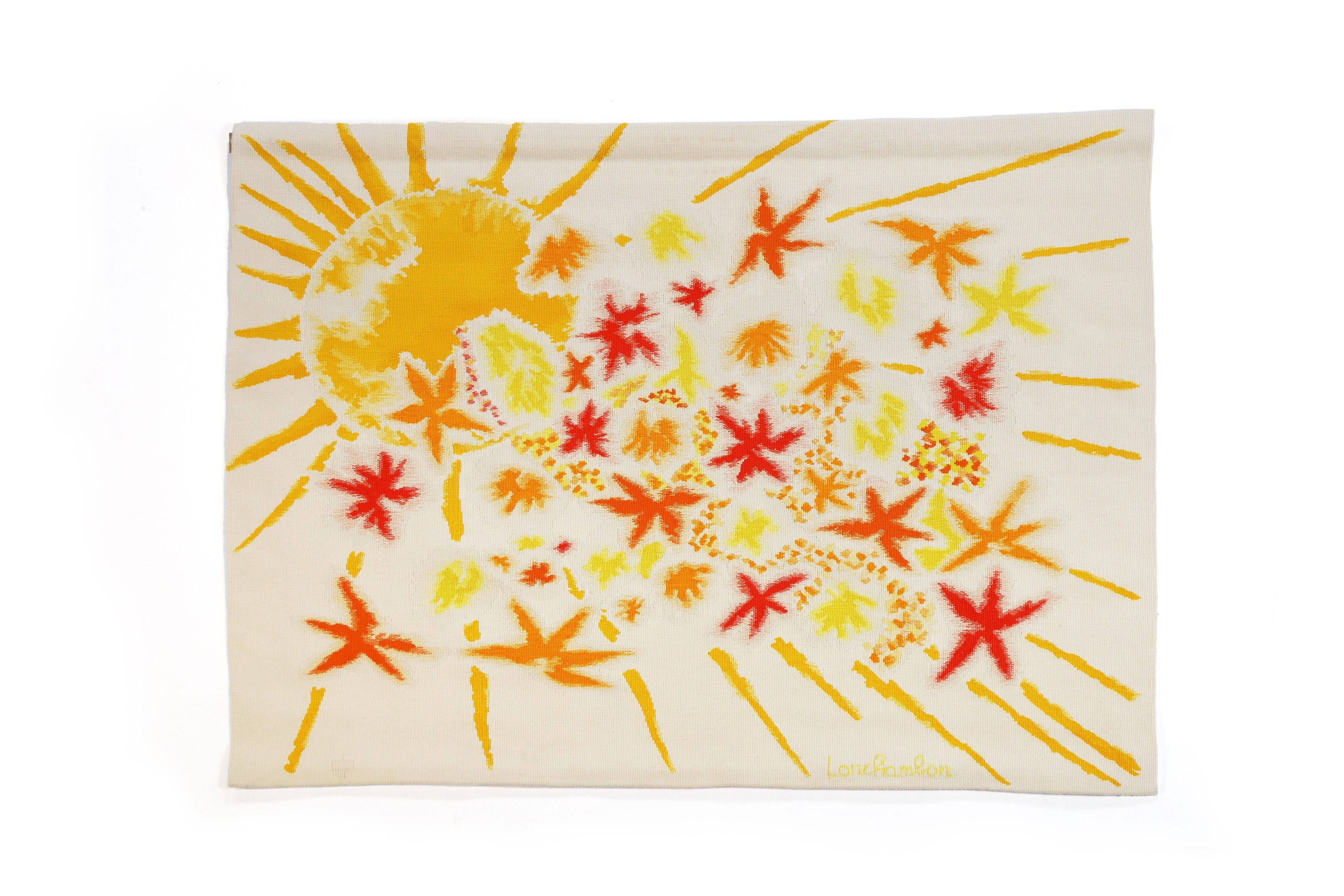 In polychrome wool, decorated with a yellow sun and orange and red stars on an ecru background.