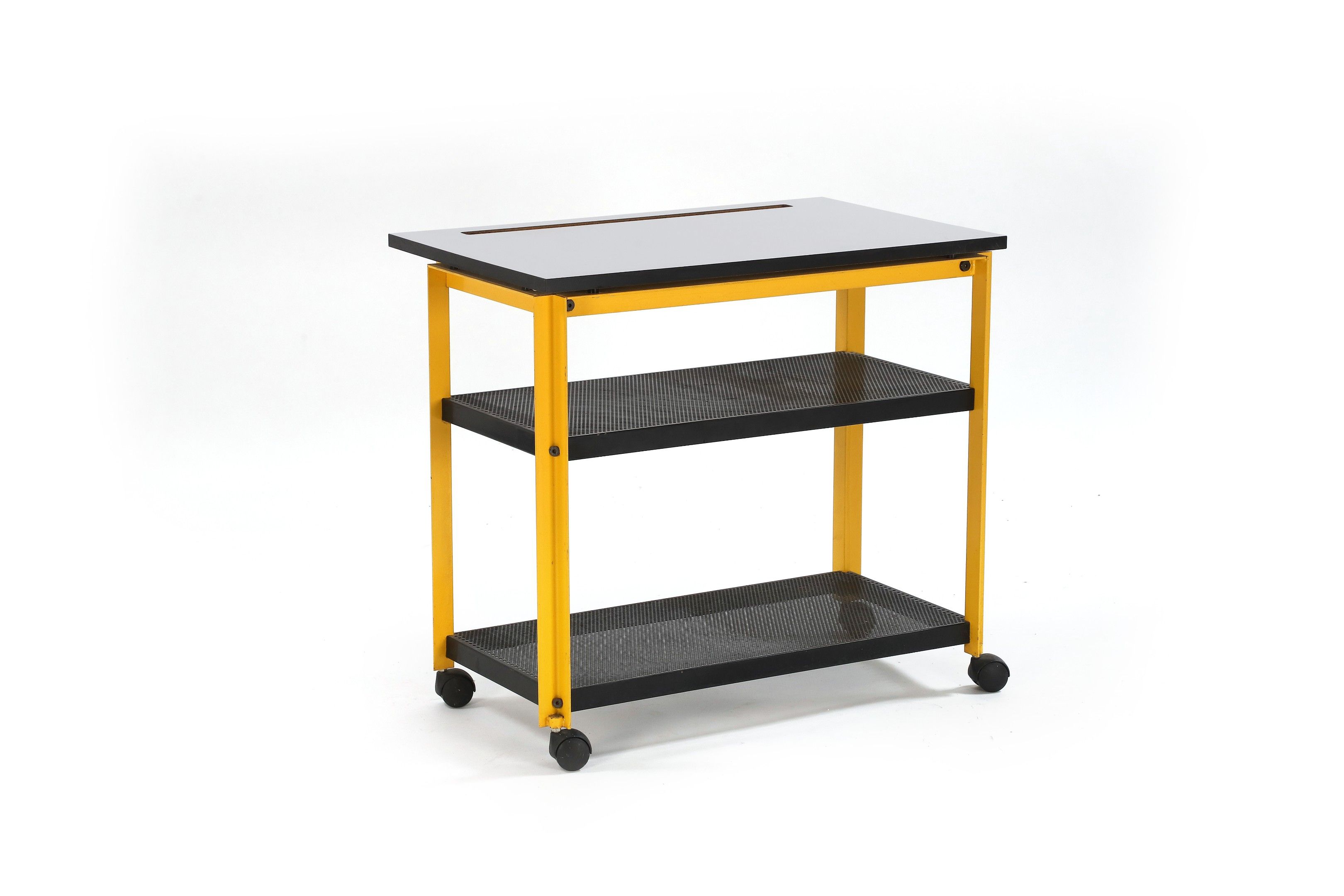 Yellow lacquered steel legs, one on castors, rectangular top in white melamine, the two lower tops of the side table in black lacquered perforated metal.