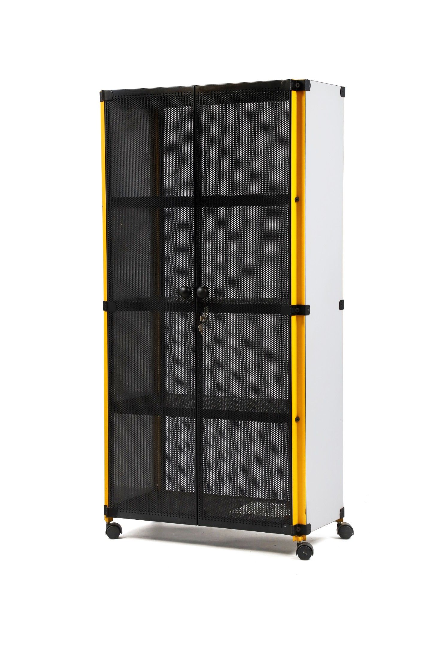A cabinet, c. 1977, yellow lacquered steel and white melamine structure, black lacquered perforated metal shelves, black melamine back, on wheels.
