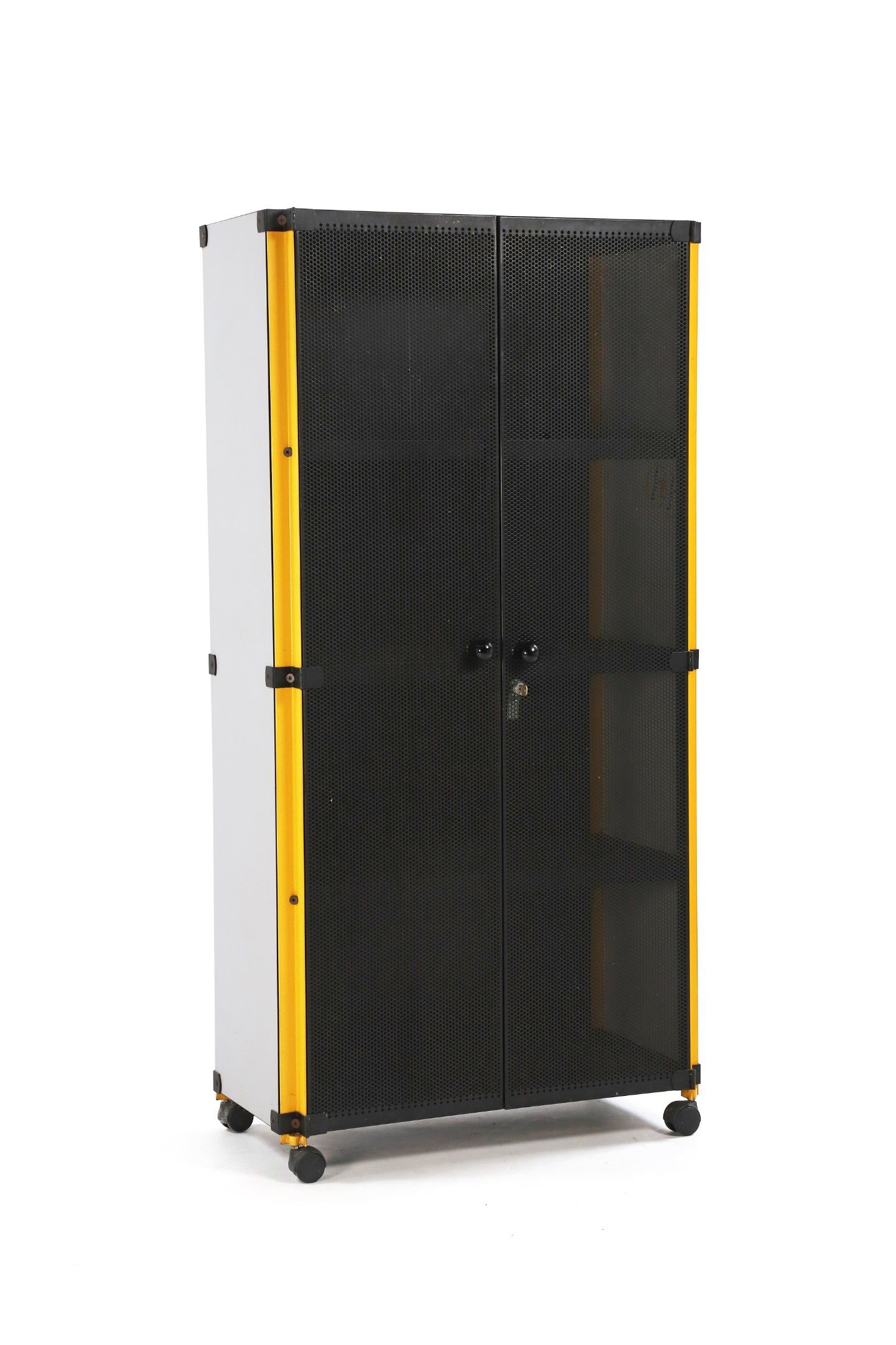 A cabinet, c. 1977, yellow lacquered steel and white melamine structure, black lacquered perforated metal shelves, on wheels.