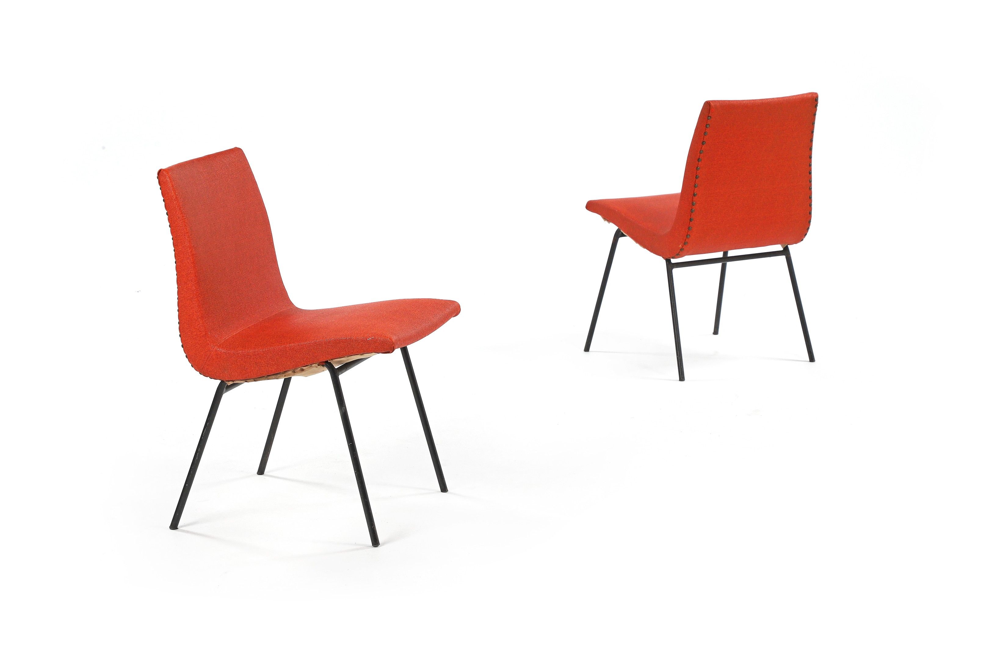 A pair of chairs, model 'CM145', c. 1945, seat and backrest filled with foam covered with original orange plastic, black lacquered metal feet. Producer's labels.